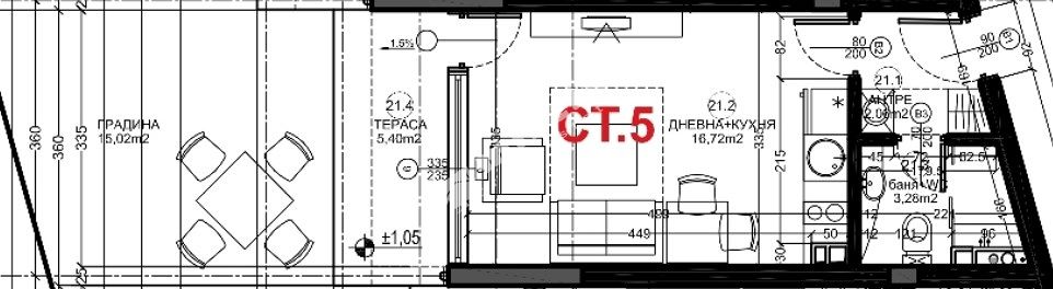 Разпределението на студиото включва: антре 2,06 кв.м, дневна с кухненски бокс 16,72 кв.м, баня с тоалетна 3,28 кв.м, тераса 5,40 кв.м, градина 15,02 кв.м.