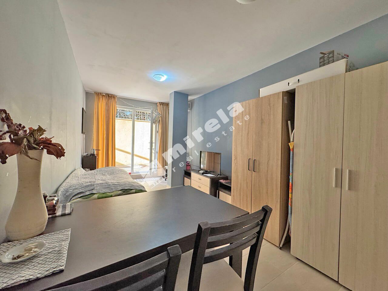Студиото се намира партерен етаж етаж, с площ от 29 кв.м. Разпределението му е отворен план с кухненски кът, зона за сън, баня с тоалетна и тераса.
