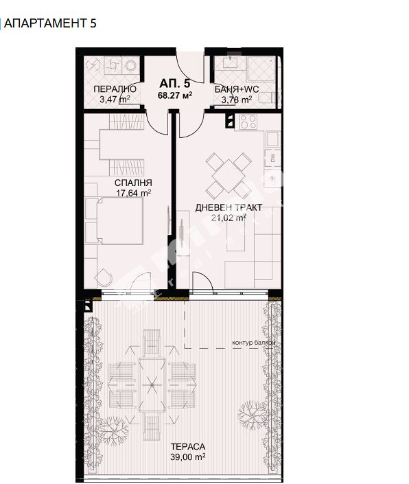 Апартаментът се намира на първи етаж от общо пет и се състои от всекидневна с кухненска част 21.02 м2, спалня 17.64 м2, коридор, баня с тоалетна 3.78 м2, перално помещение 3.47 м2 и балкон 39.00 м2.