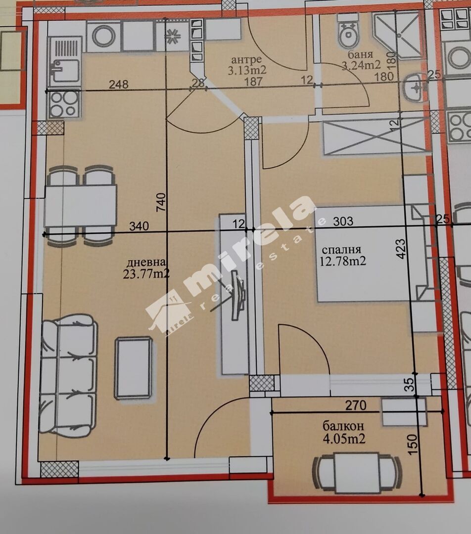 Разпределение: всекидневна с кухненски бокс, спалня, баня с тоалетна, коридор и лоджия.