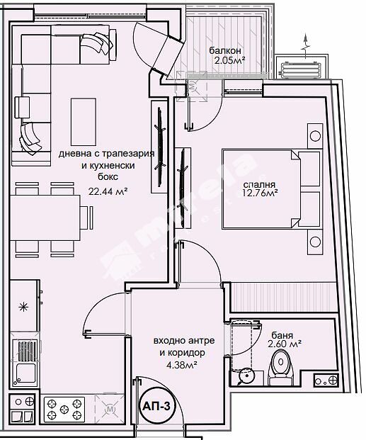 С тази оферта презентирам 2-стаен апартамент със следното разпределение: антре, дневна с кухненски бокс, спалня, баня с тоалетна и балкон.