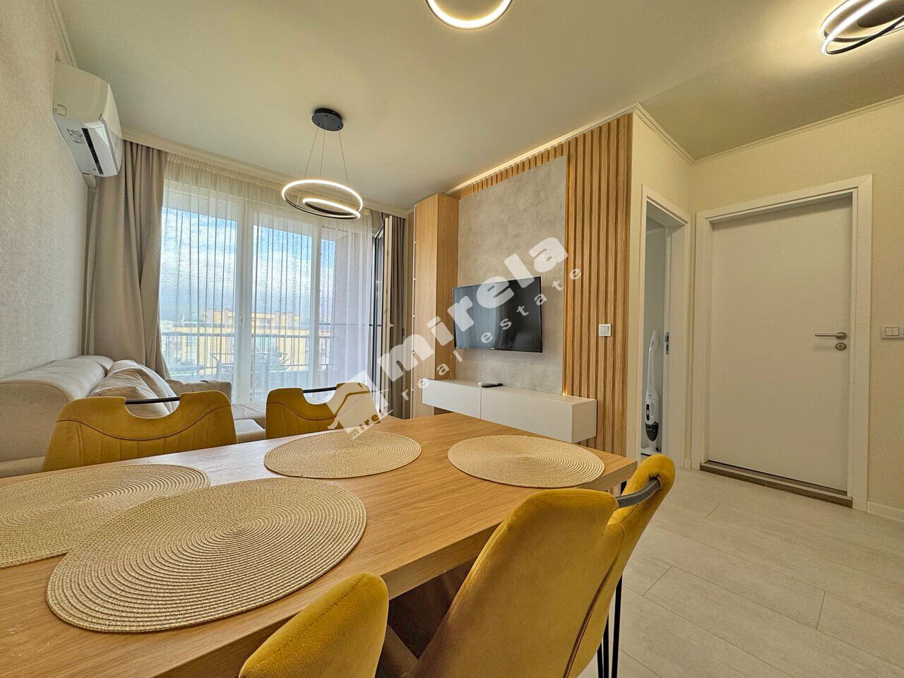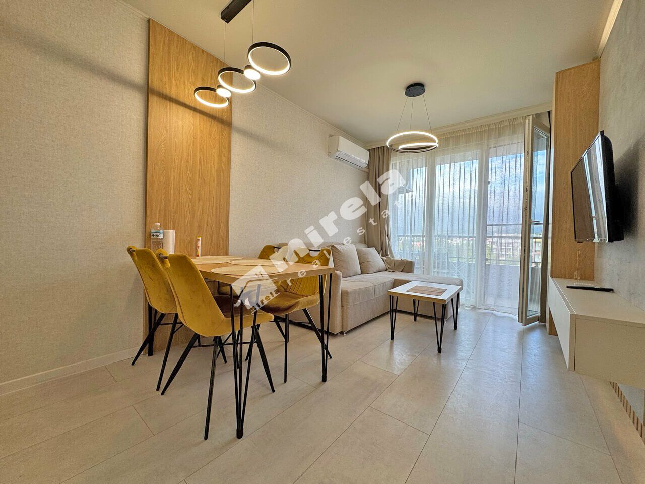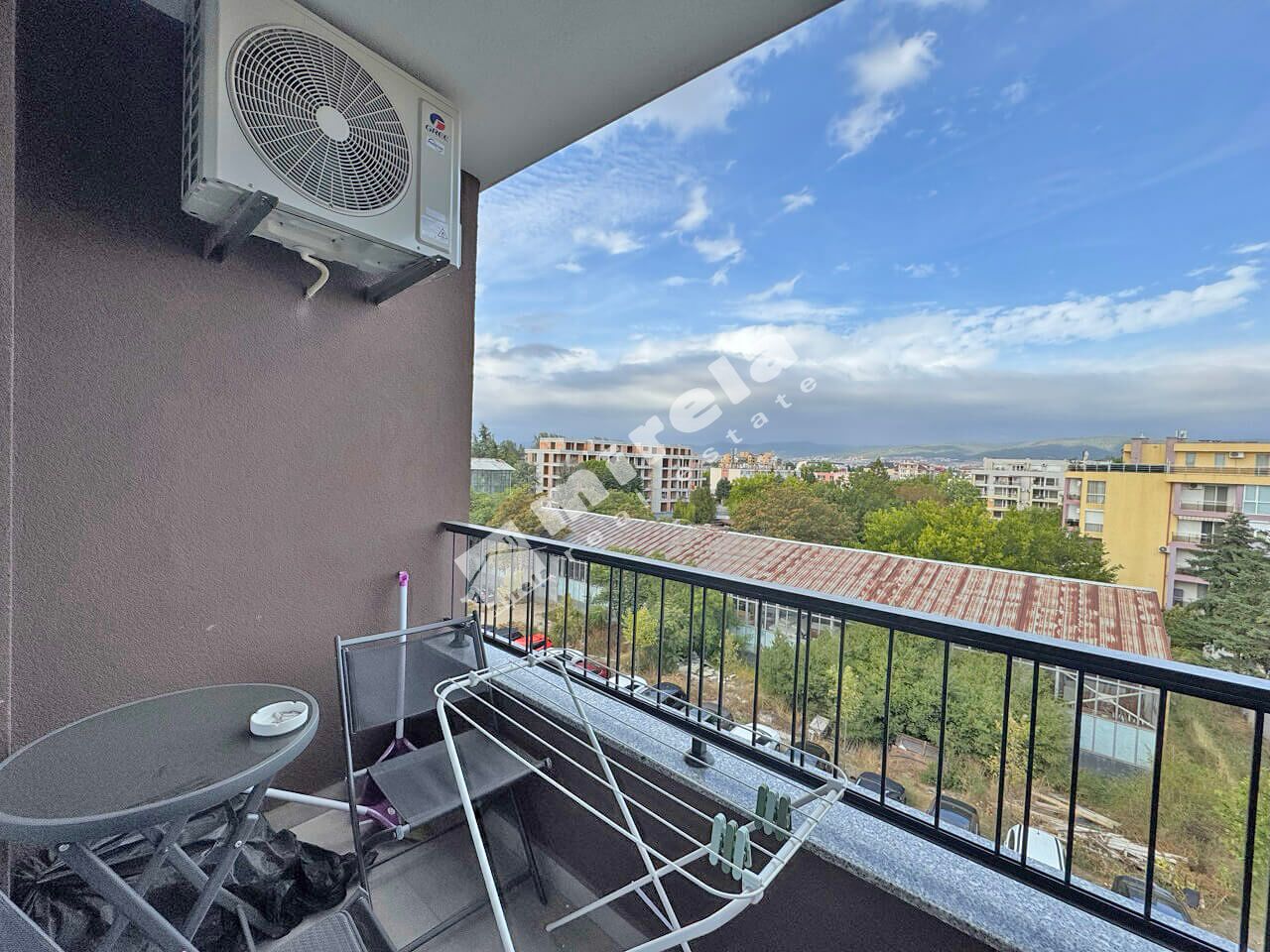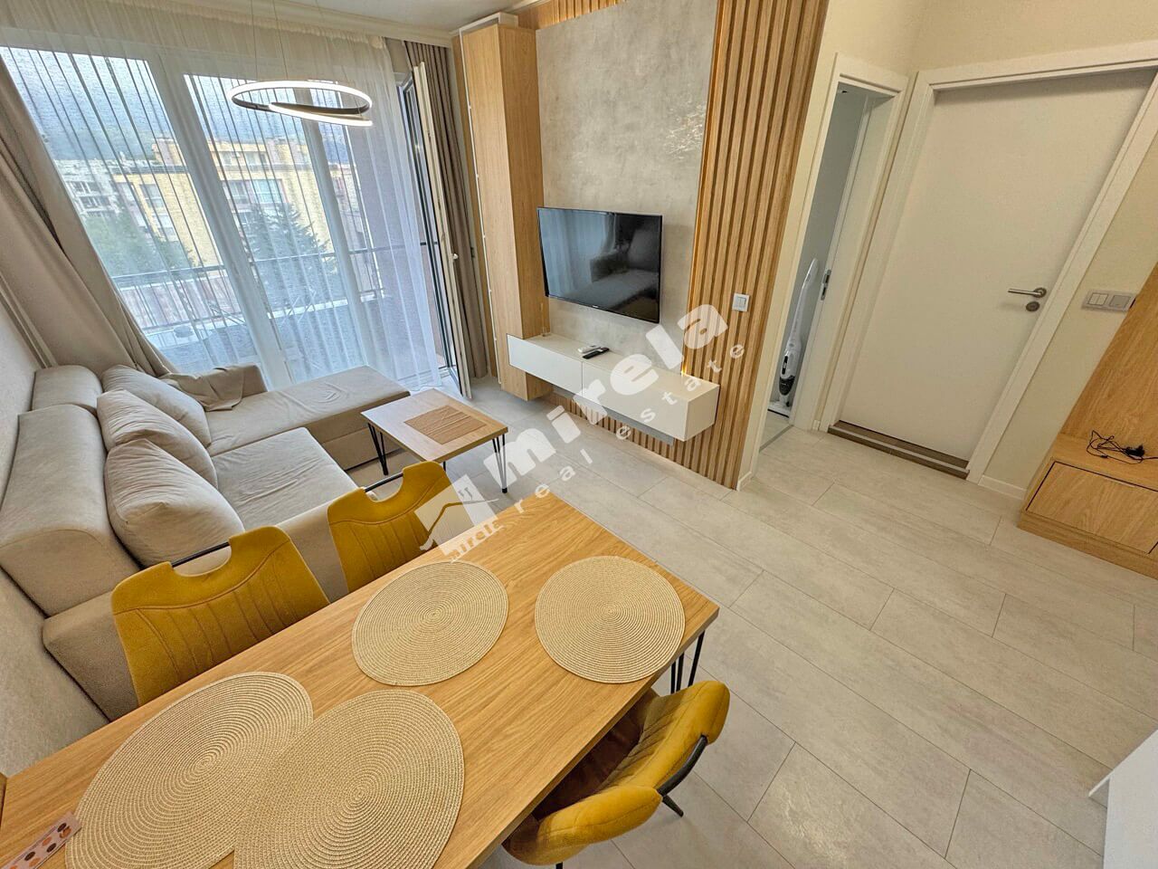 Апартаментът е разположен на петият етаж и е с красива гледка към планината. Разпределението е: входно антре, всекидневна с кухненски бокс, една спалня, баня с тоалетна и тераса. Жилището е луксозно обзаведено готово за нанасяне.