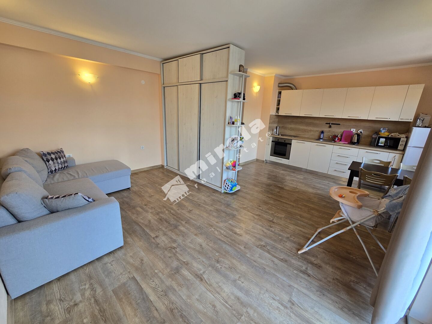 Апартаментът се състои от антре, дневна с кухненски бокс, спалня, балкон, баня с тоалетна.