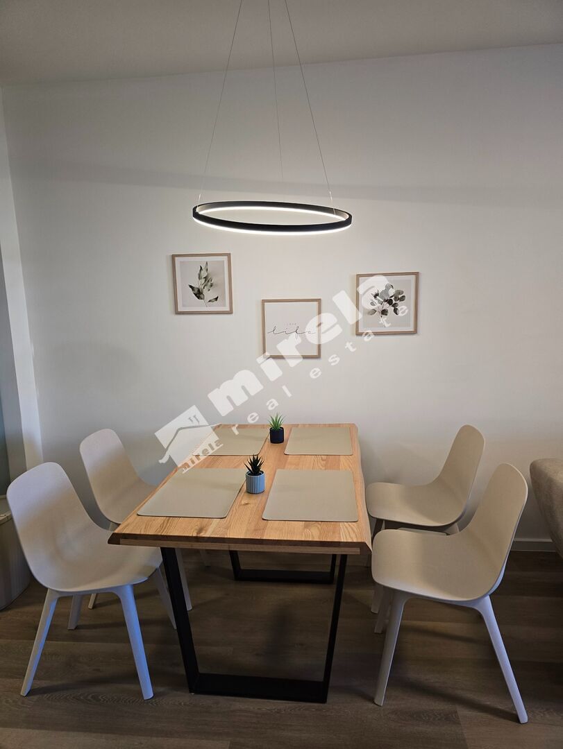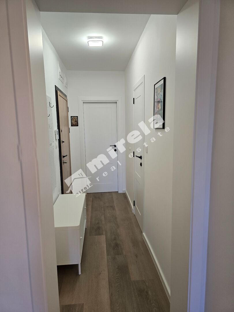 Разпределение: коридор, просторна дневна стая с трапезария и кухня , спалня, баня с тоалетна, две тераси, едната от които е остъклена с френски прозорци.