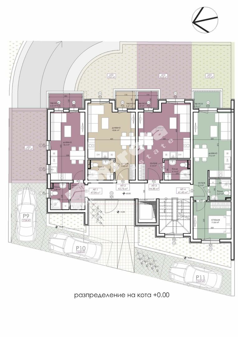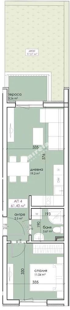 Разпределение: антре, дневна с кухненски кът и трапезария, спалня, баня с тоалетна, тераса.