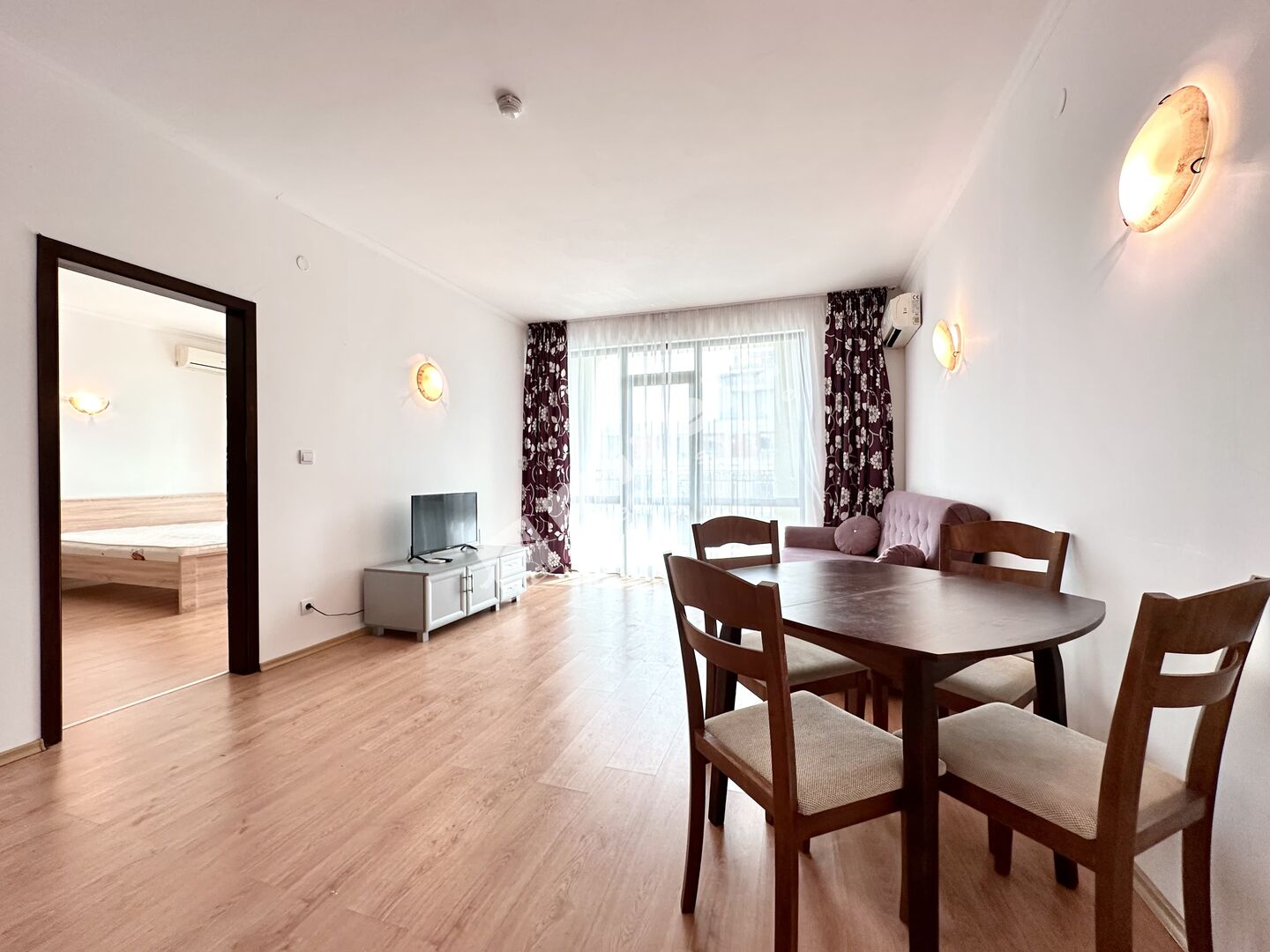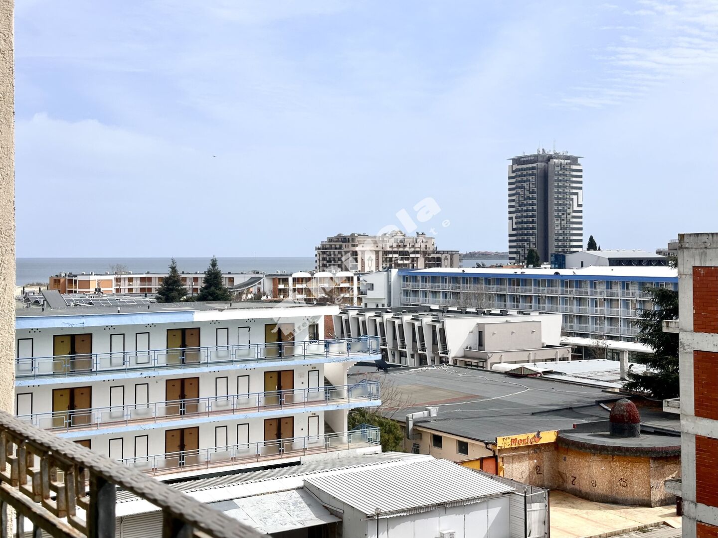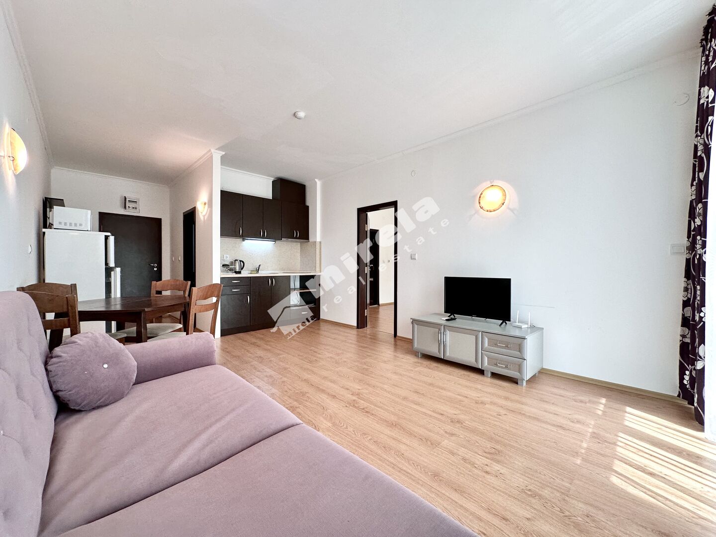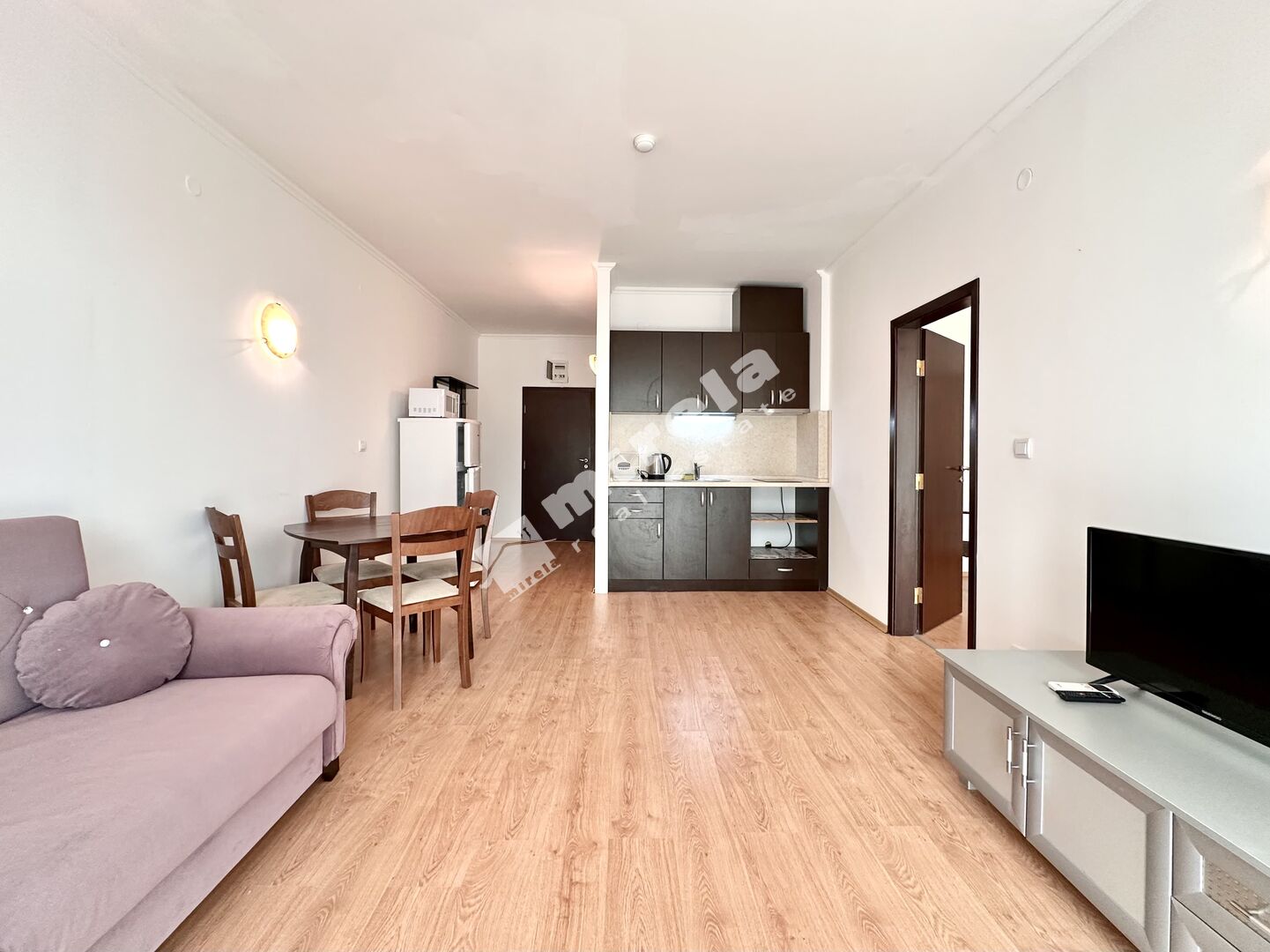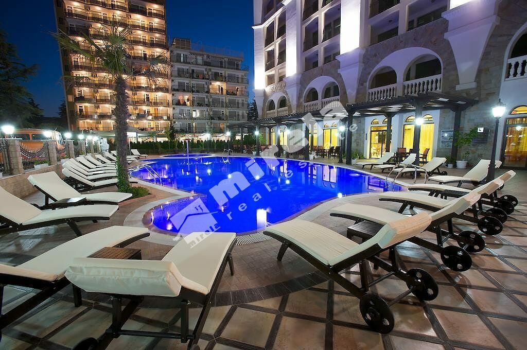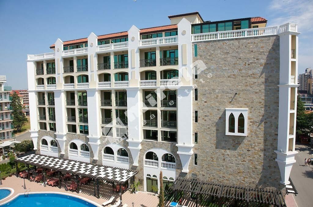 Апартаментът, който предлагам за продажба е с южно изложение, гледка към морето и басейна. Продава се във вида, показан на снимките - обзаведен и оборудван, готов за нанасяне. Разполага със следното разпределение - всекидневна с кухня, спалня, две бани, тераса. Ниска такса поддръжка в размер на 8 евро на кв.м. на година /приблизително 55 евро на месец/.