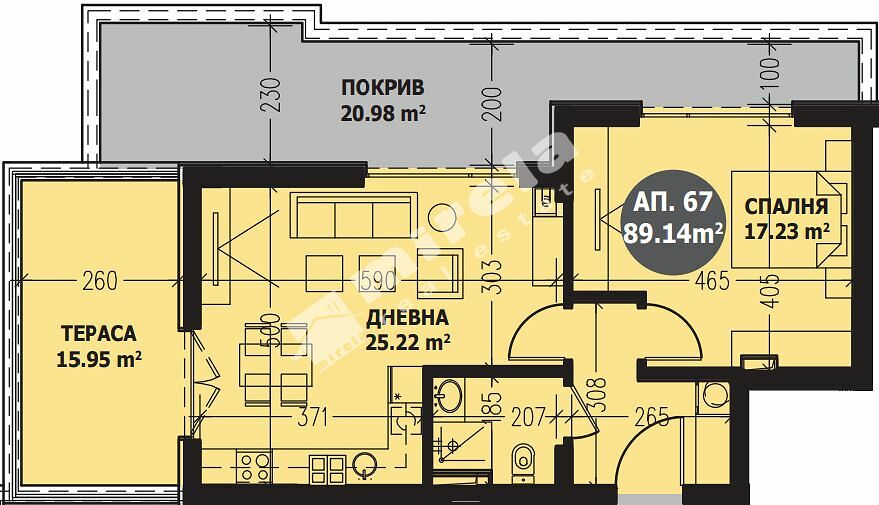 Жилището се състои от антре, дневна с трапезария и кухненска част, спалня, баня с тоалетна и тераса. Има и прилежаща покривна тераса с площ от 20.98 кв. м.