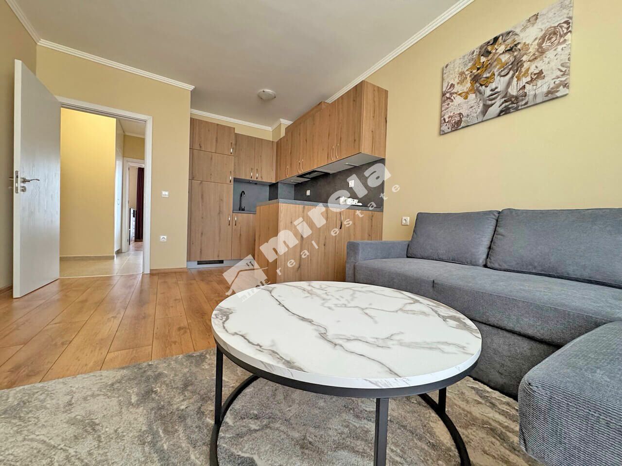 Апартаментът е разположен на четвърти жилищен етаж и има следното разпределение: коридор, всекидневна с кухненски бокс, една спланя, баня със саниратен възел и тераса с панорамна гледка море.