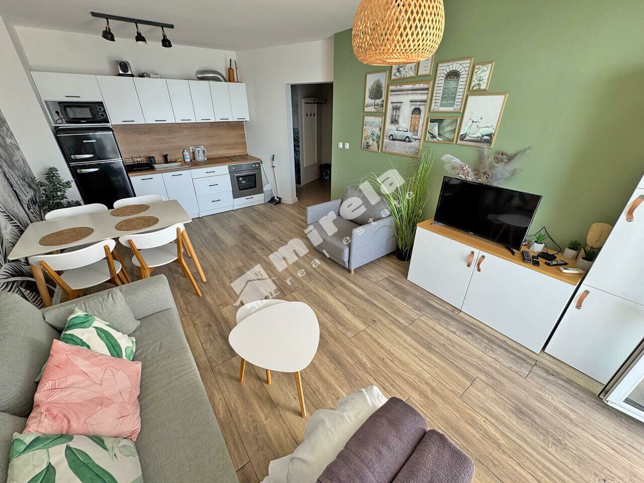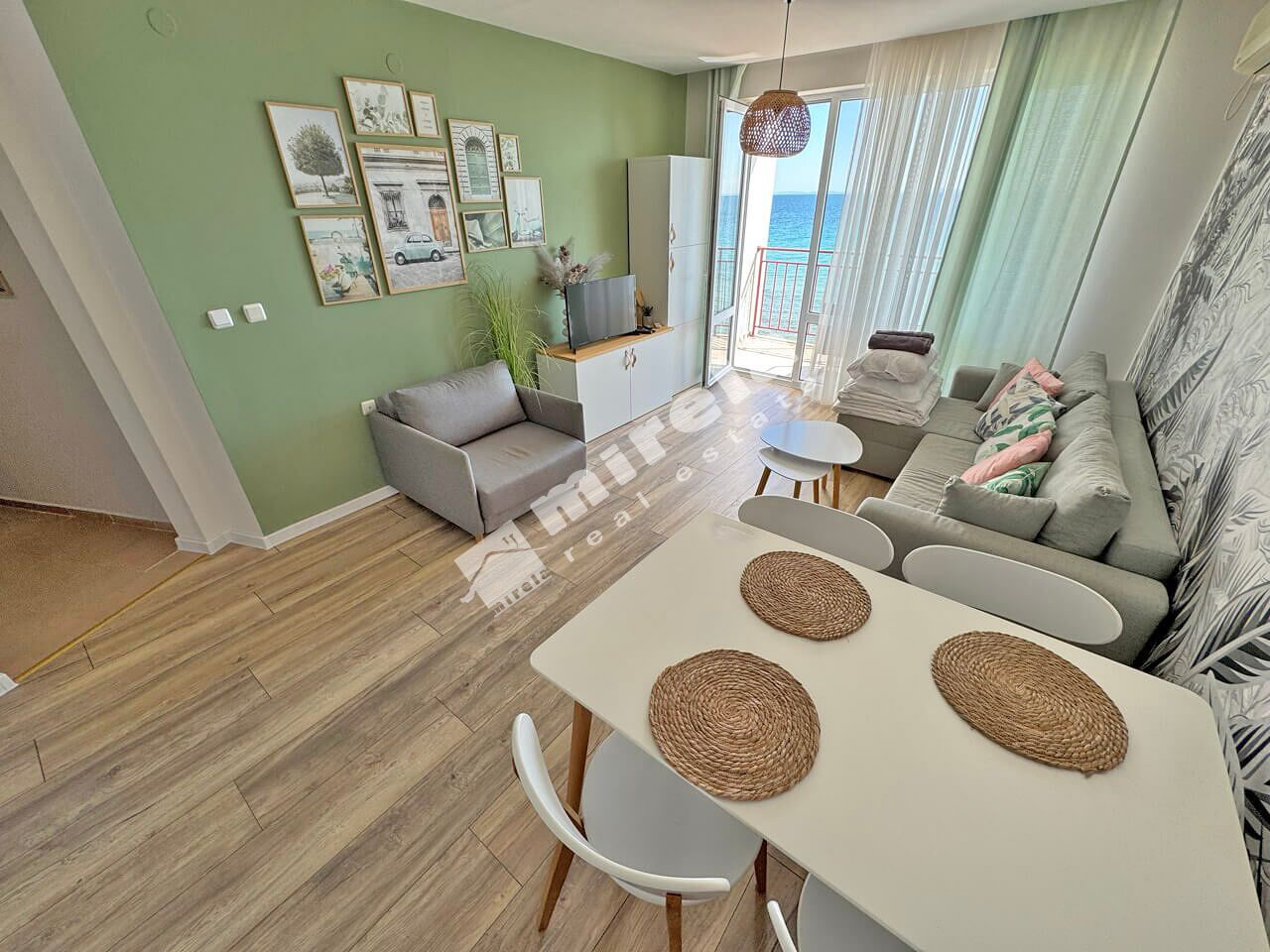 Апартаментът е разположен на втори етаж в сграда разположена на първа линия море, и е с разпределение: коридор, всекидневна с кухненски бокс, една спалня, санитарен възел и тераса. Имотът е подходящ, както за лично ползване, така и за отдаване под наем.
