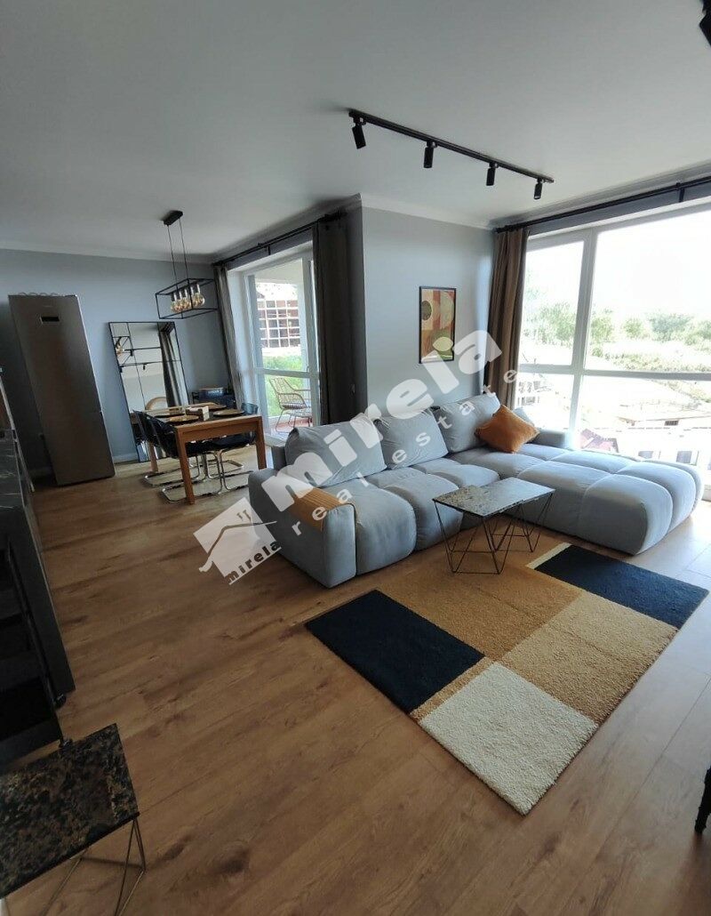 Разпределение на апартамента: антре, просторна всекидневна с трапезария и кухненски бокс, две спални, баня с вана и тоалетна, втора баня и тоалетна, килер, балкон.