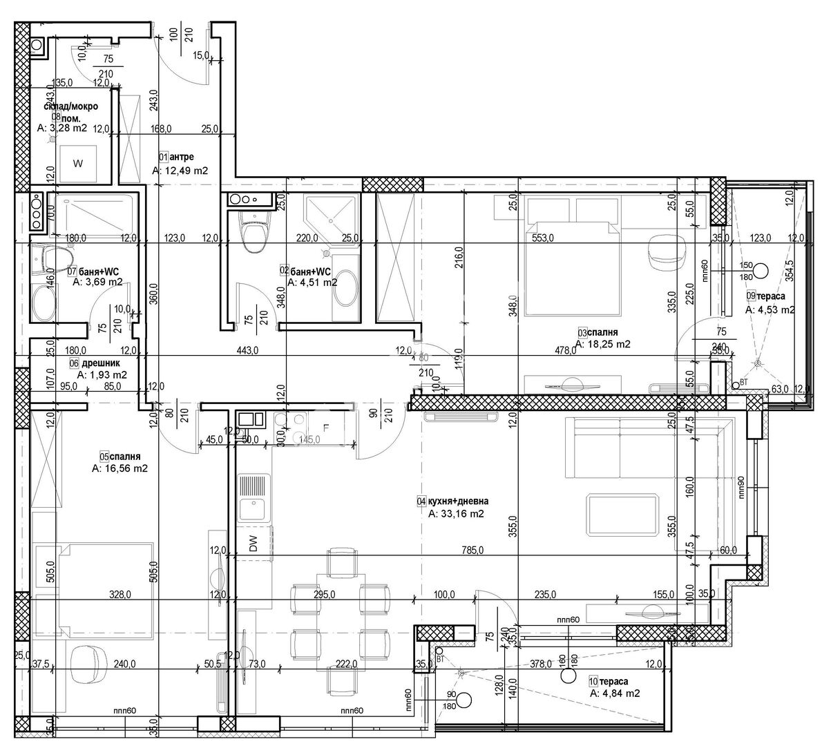 Апартаментът е със следното разпределение: антре, дневна с кухненски бокс, две спални, две бани с тоалетни, склад и две тераси.