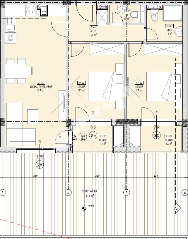 Апартаментът, който Ви представяме с тази оферта, се намира на партерното ниво и има следното разпределение: коридор, дневна с кухненски бокс, две достатъчно големи спални, баня с тоалетна, отделна тоалетна и двор към апартамента с площ 66.30 кв. м.