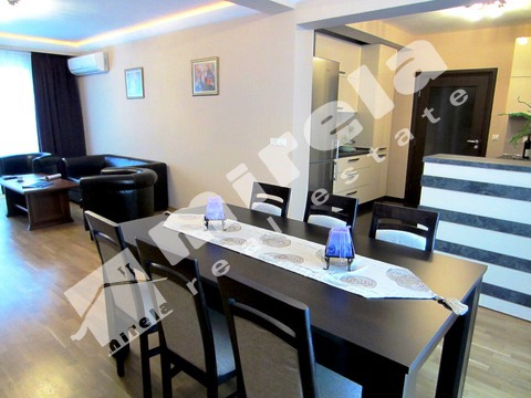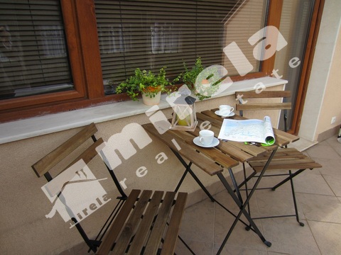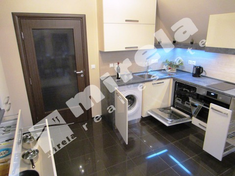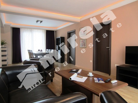 Апартаментът се предлага обзаведен с всичко необходимо за живеене, бяла и черна техника, посуда.