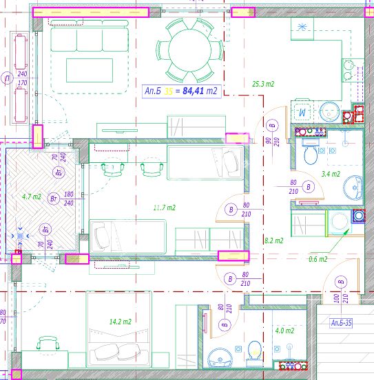 Имотът има следното разпределение: антре, дневна с кухненски бокс, две спални, две бани с тоалети и тераса.