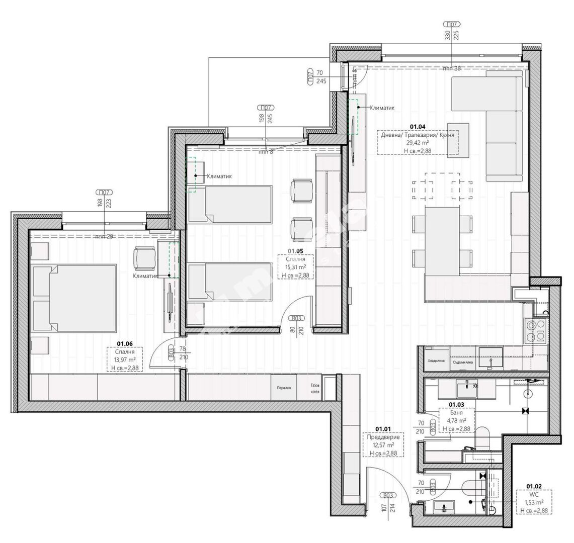 Construction type: reinforced concrete structure with hanging facade and brickwork