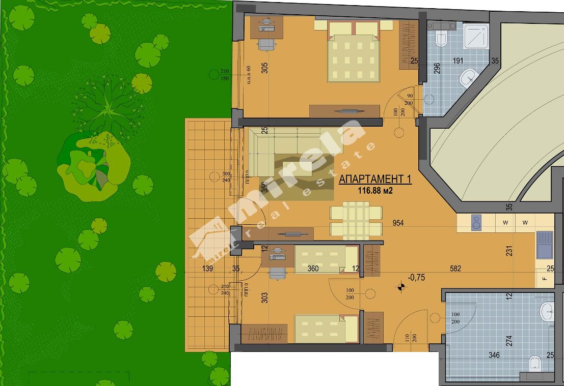 Апартаментът се намира на 1-ви от 8 етажа и е със западно изложение. Разпределението му е: антре, дневна с кухненски бокс и трапезария, две спални, две бани с тоалетна.