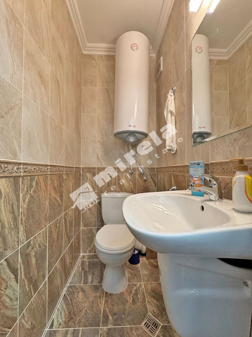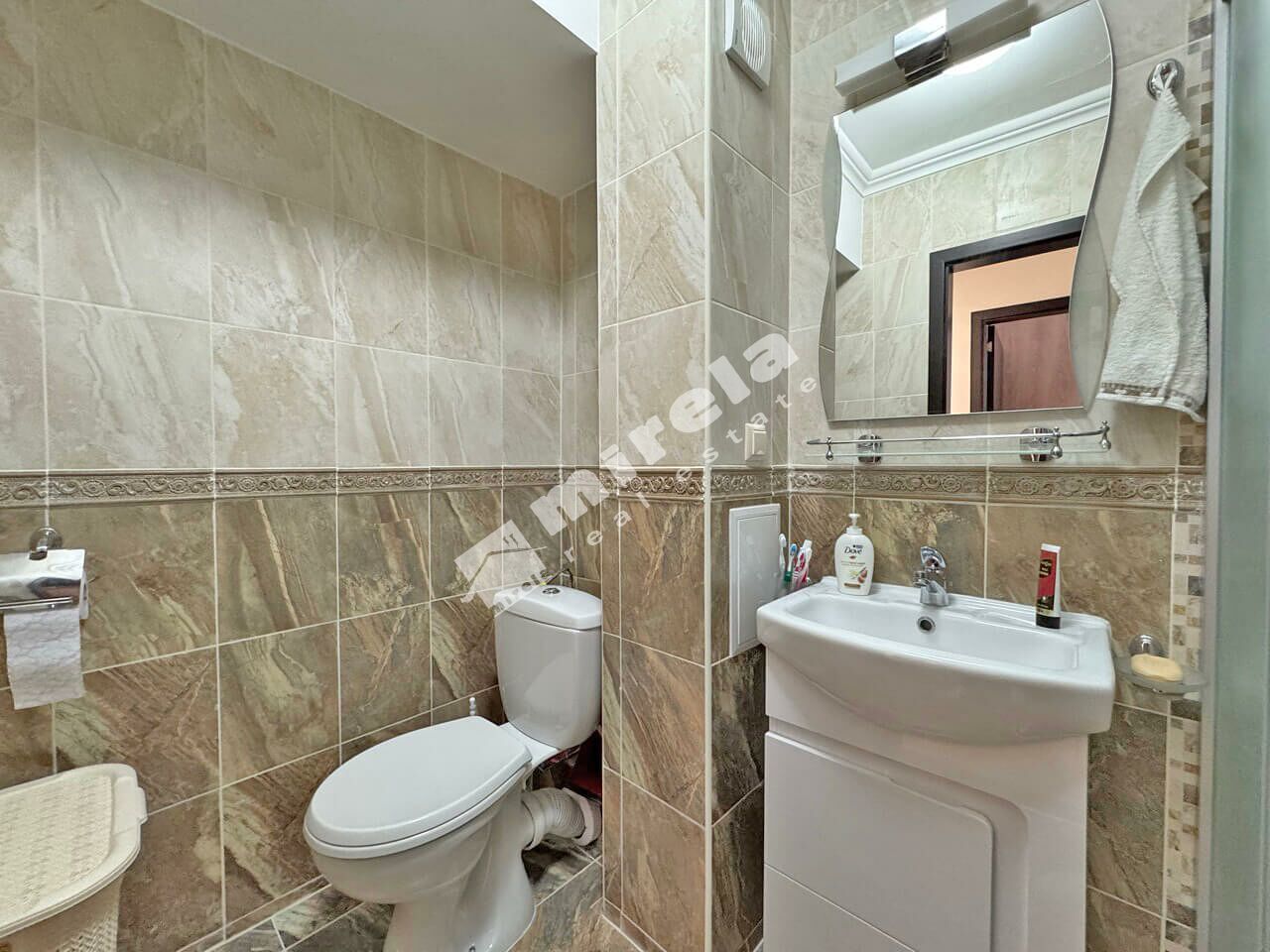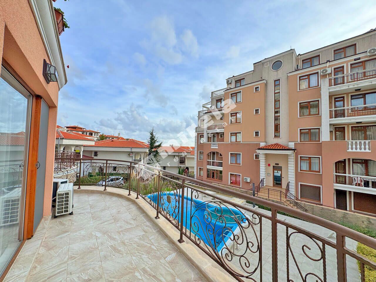 Апартаментът е разположен на втори жилищен етаж над партер с площ от 100 кв.м., и е със следното разпределение: коридор; просторна всекидневна; две спални; баня със санитарен възел; отделен санитарен възел; и голяма тераса с директен достъп до басейна. Имотът е напълно обзаведен и оборудван, както за лично ползване така и за отдаване под наем.