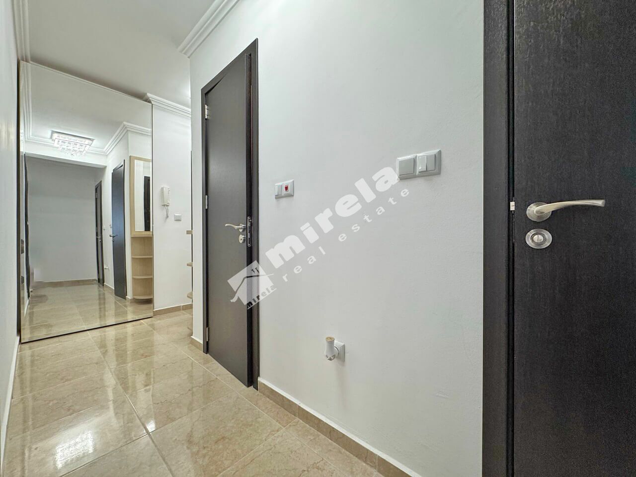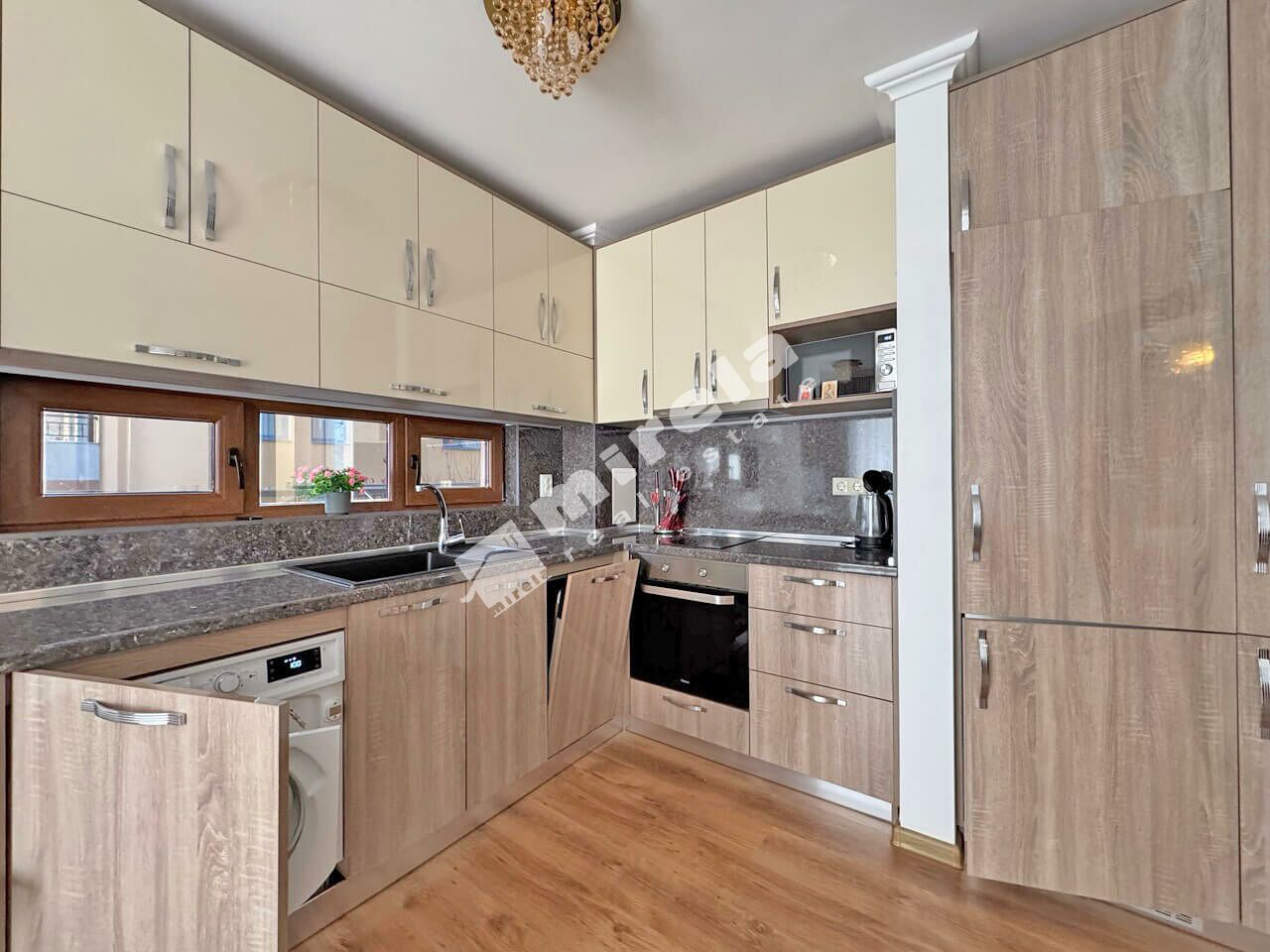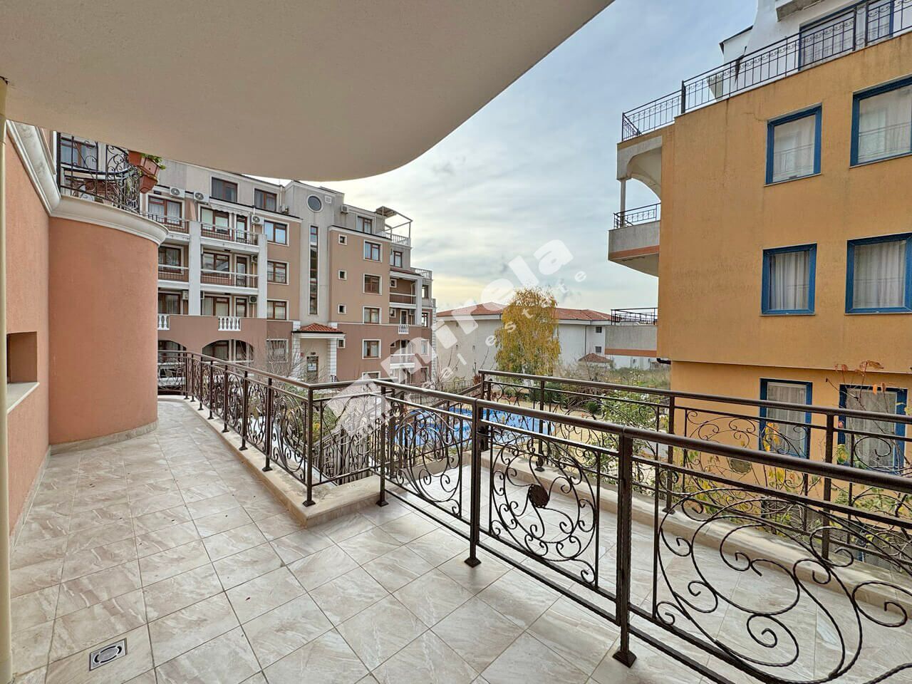 Апартаментът е разположен на втори жилищен етаж над партер с площ от 100 кв.м., и е със следното разпределение: коридор; просторна всекидневна; две спални; баня със санитарен възел; отделен санитарен възел; и голяма тераса с директен достъп до басейна. Имотът е напълно обзаведен и оборудван, както за лично ползване така и за отдаване под наем.
