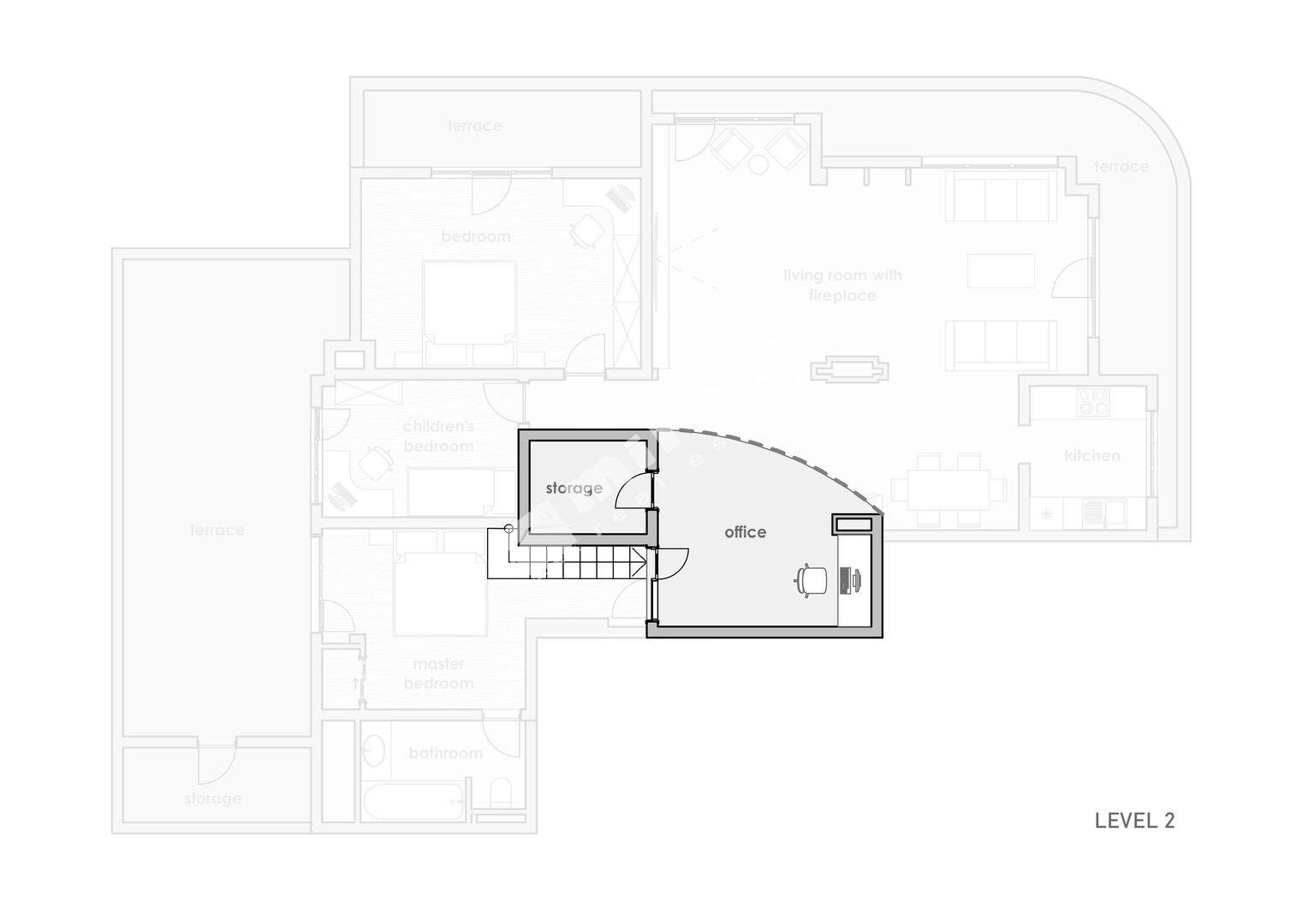 Стълбище води към второ ниво с емпоре, удобно за кабинет.