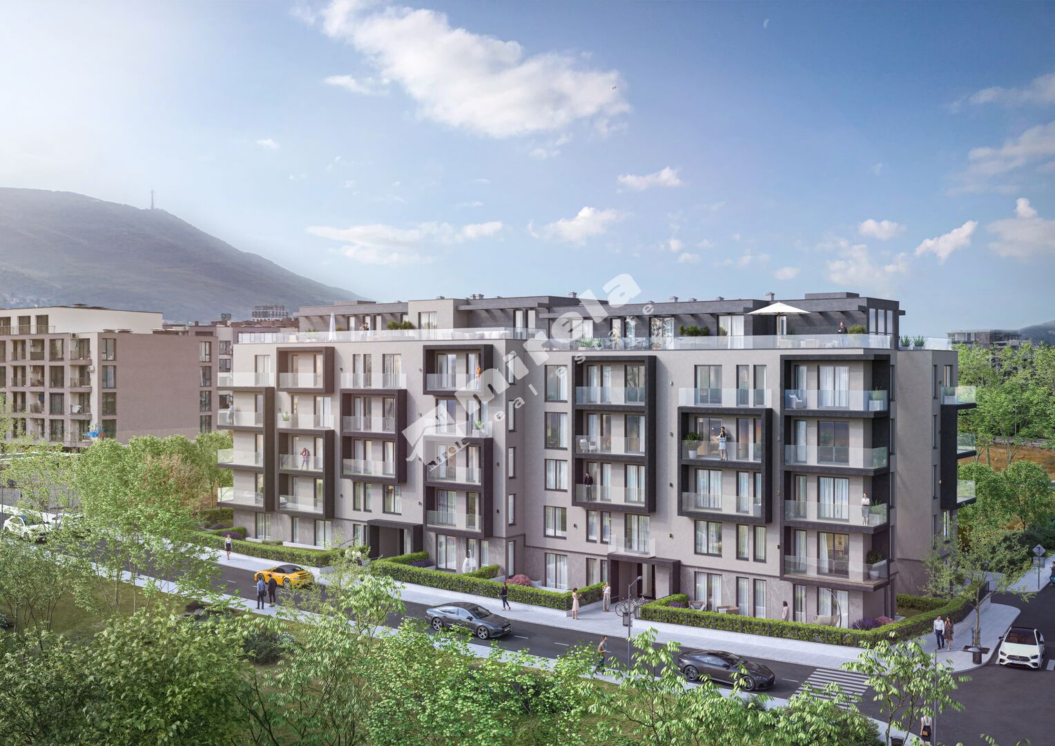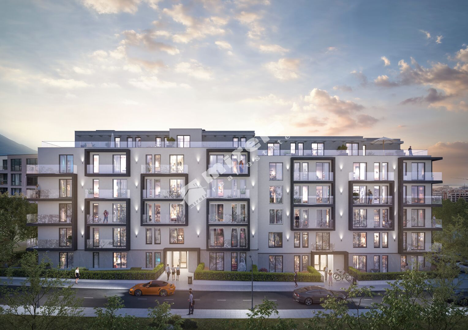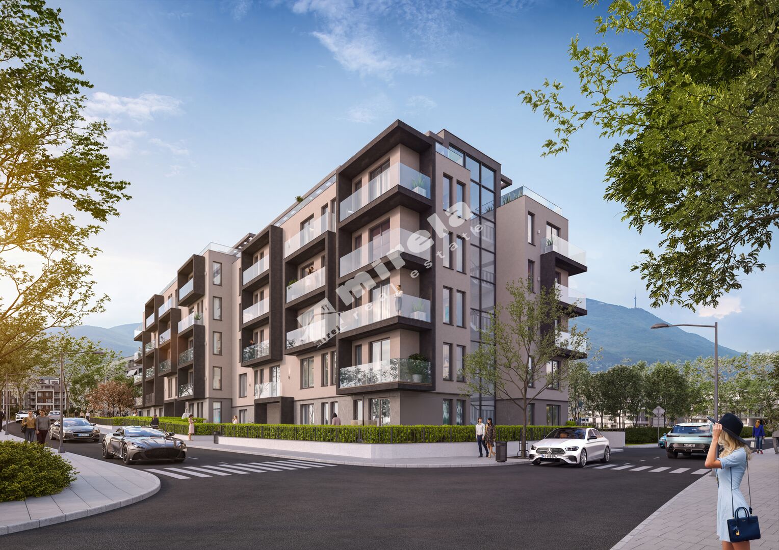 Сградата е отличителна архитектура, с динамична визия и просторни тераси, които осигуряват естествена светлина и усещане за свобода във всеки дом.