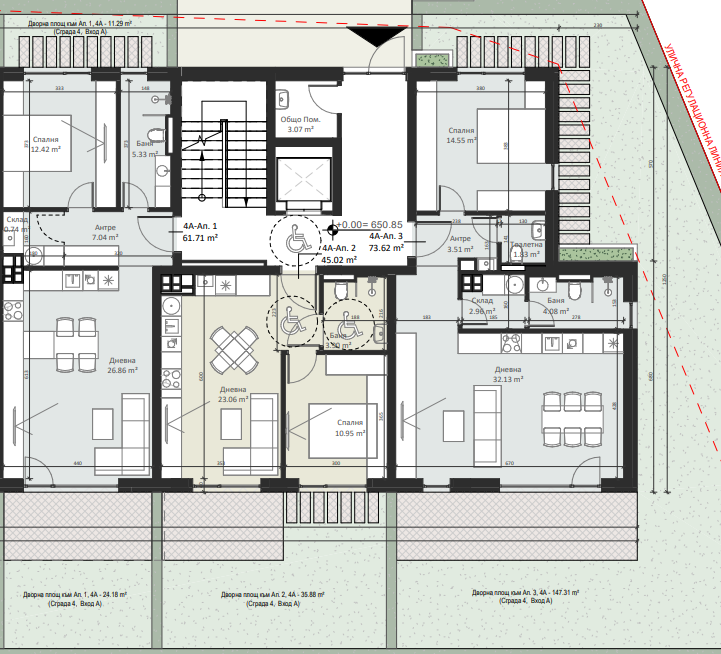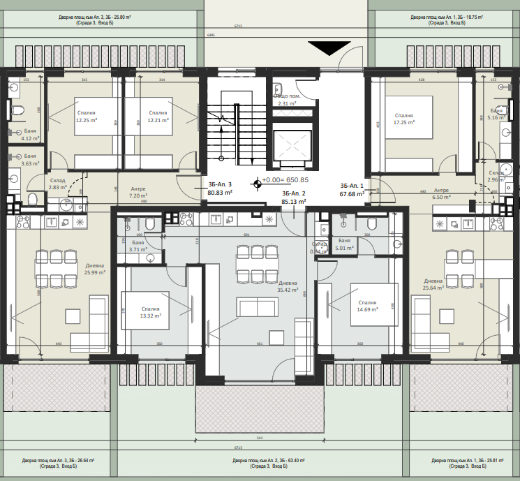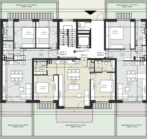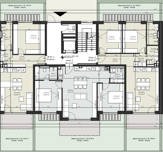 | Apartment 3, 1 BR APARTMENT, Entrance А, 84.77 m2, (Built-up area 73.62 m2), € 170 000 (€ 2 005/sq.m) | AVAILABLE |