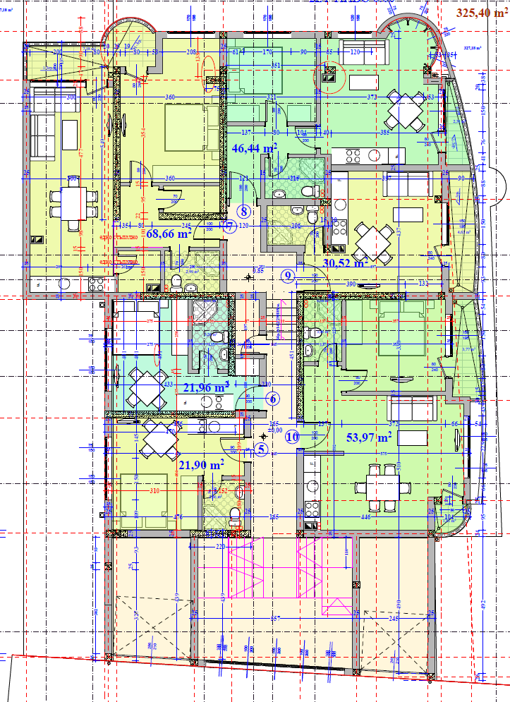 Сградата е 6 етажна с 26 апартамента: едностайни, двустайни и тристайни, както и няколко гаража и открити паркоместа.