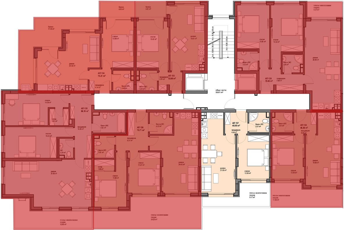 За сградата: състои се от два входа. Вход А на 9 етажа. Вход Б на 8 етажа. Партерно ниво с гаражи и паркоместа.