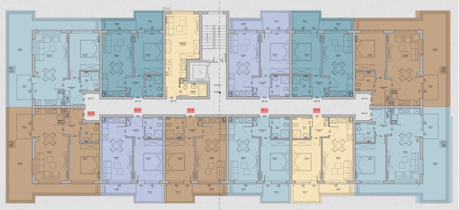 Комплексът включва изграждането на две сгради, състоящи се от 3 жилищни секции. Те са проектирани с подземно ниво, партер, два и три етажа, както и мансардно ниво. В подземните нива, както и в границите на имота, са организирани паркоместа за живущите. На партерният етаж в сградите са разпределени жилища със собствени дворове. Останалите етажи на трите секции включват двустайни и тристайни апартаменти.