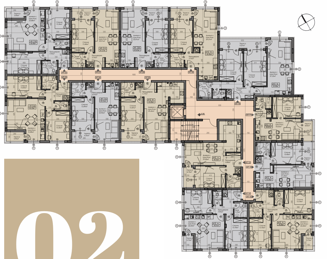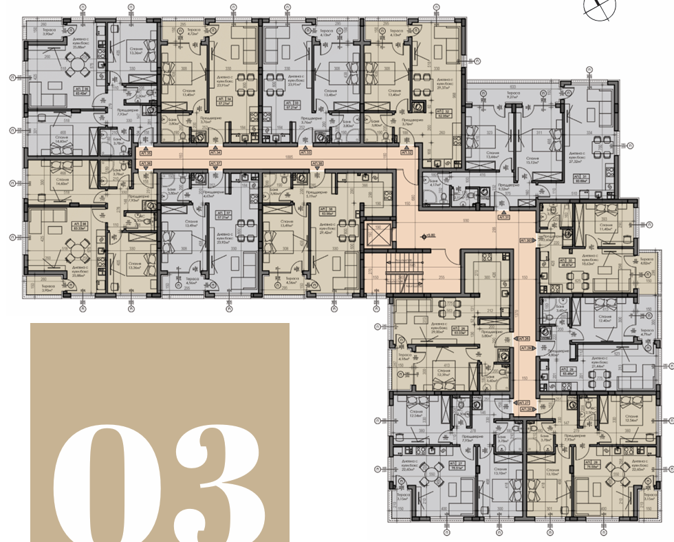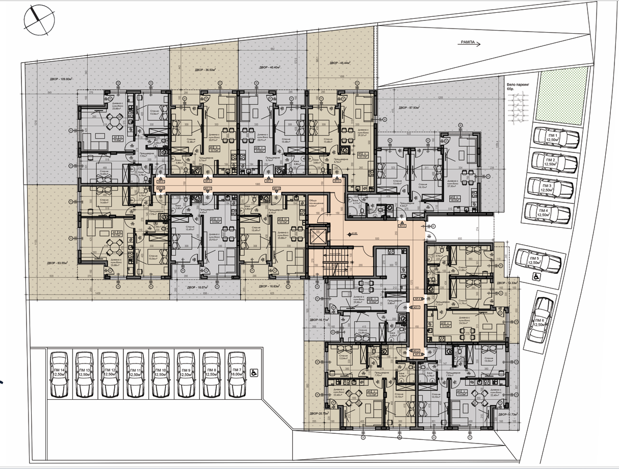 На партера са организирани 12 жилища с прилежащи дворове и 14 открити паркоместа.