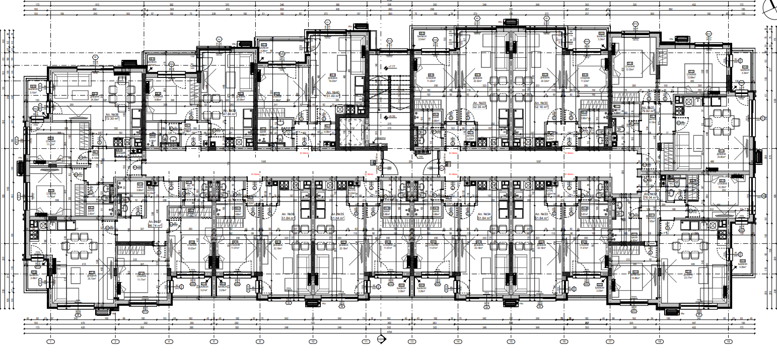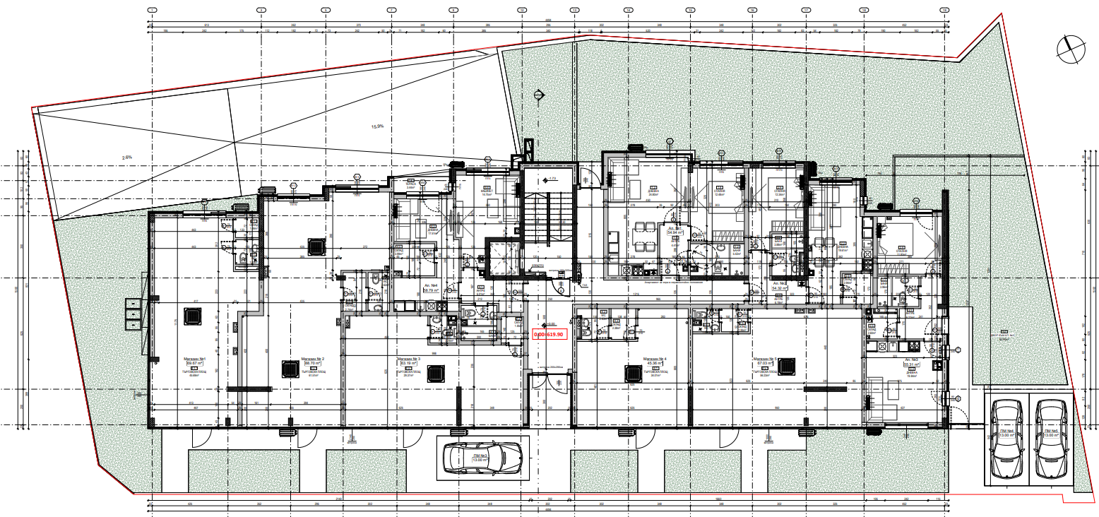 Жилищната сграда е проектирана с подземно ниво, партер, четири етажа и мансардно ниво.