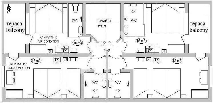 Всеки етаж се състои от 4 стаи с WC и 2 тераси.