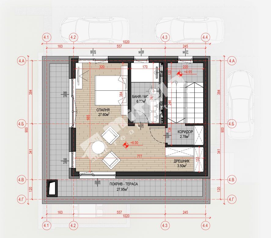 Третият етаж включва една спалня, баня с тоалетна, дрешник, коридор, стълбище и покривна тераса.