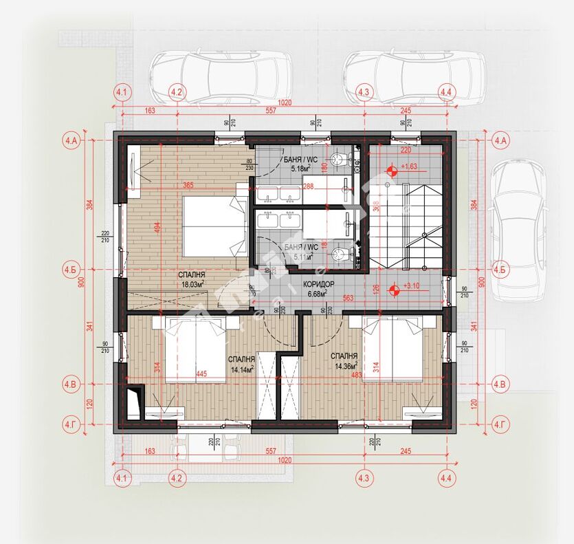 Вторият етаж се състои от три спални, две бани с тоалетни, коридор и стълбище.