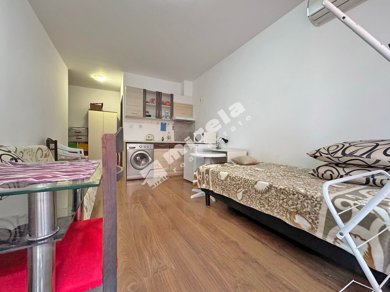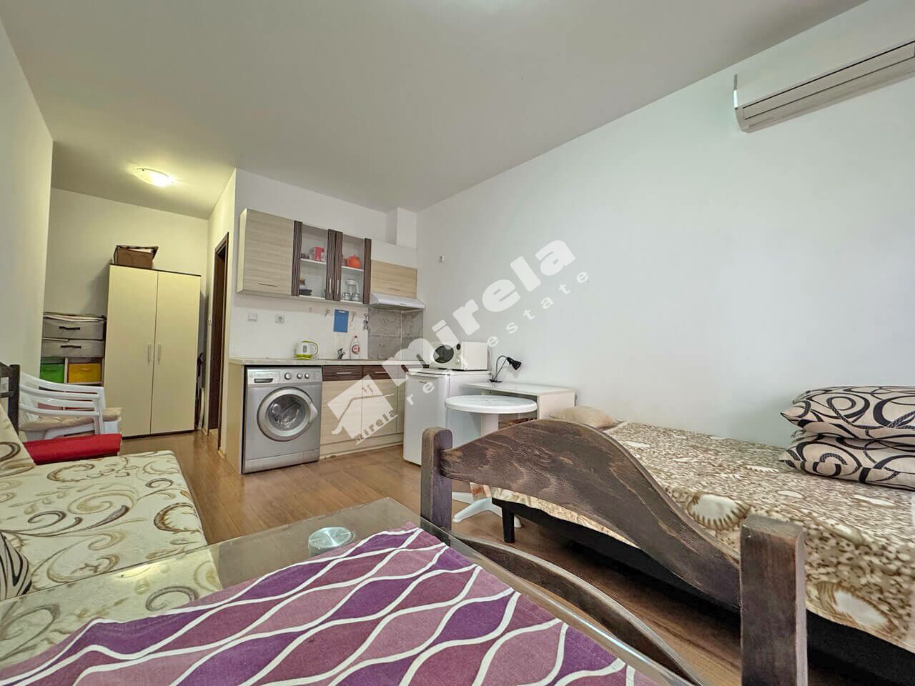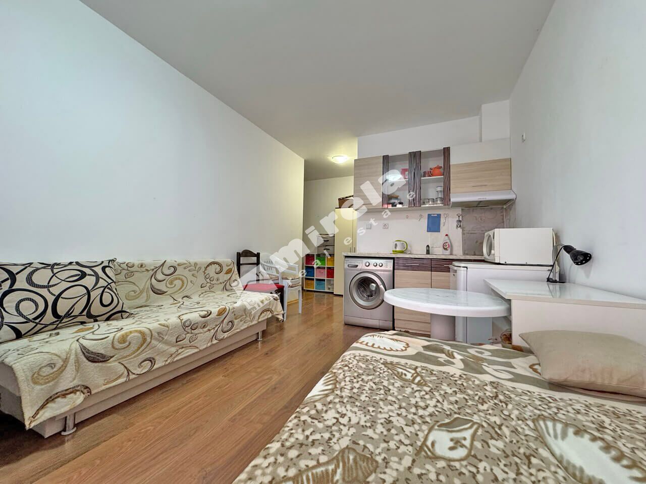 Студиото е на първи висок етаж. Състои се от малко предверие, стая с обособени кухненски кът и кът за спане, тераса и баня с тоалетна.