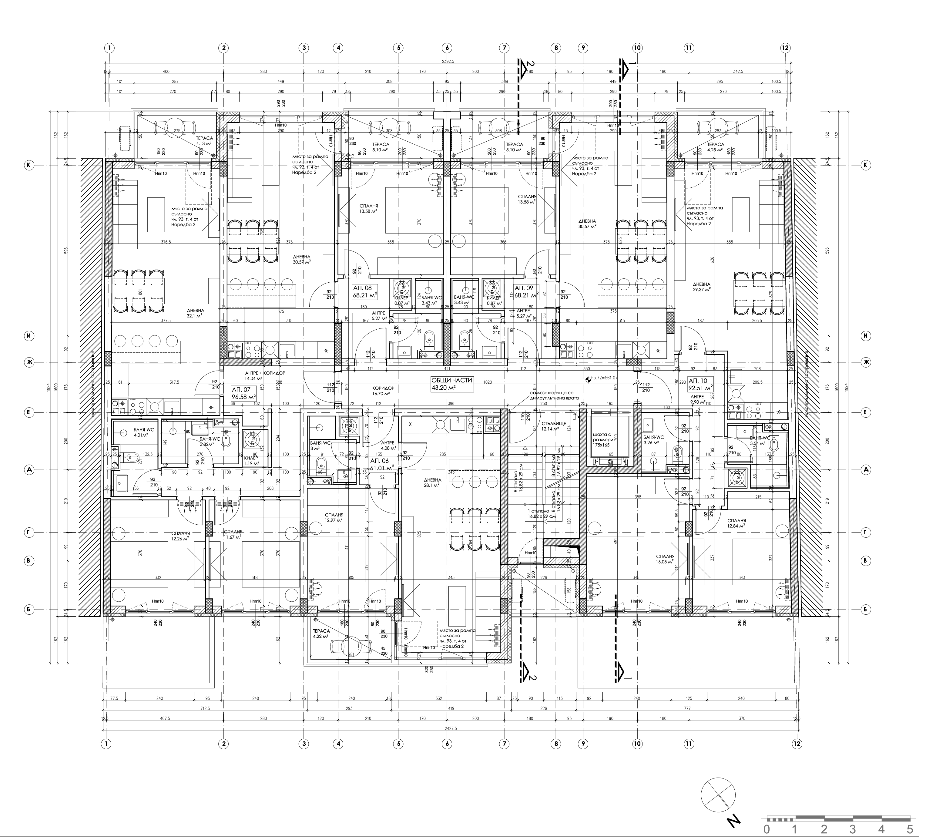 На партерния етаж са обособени 11 гаража, както и открити паркоместа във вътрешното дворно пространство. Горните етажи са реализирани с апартаменти, като на типовите етажи има по 6 жилища.