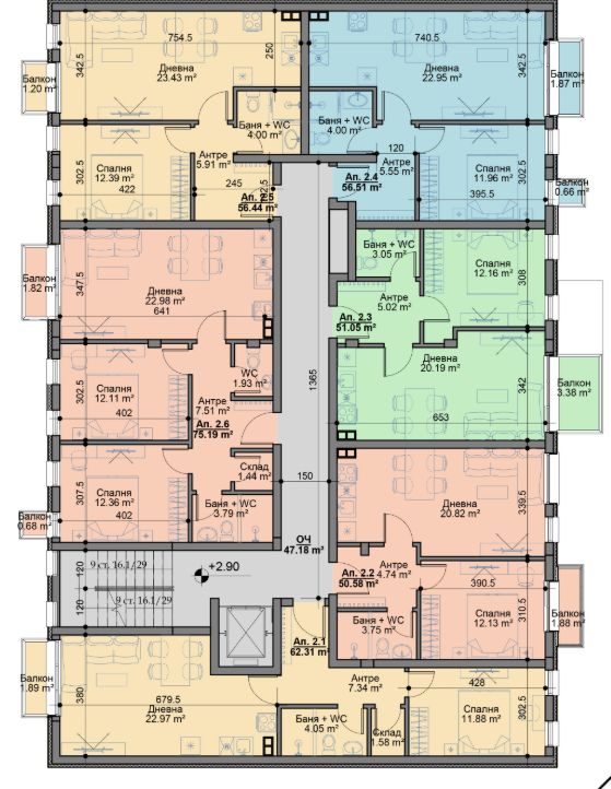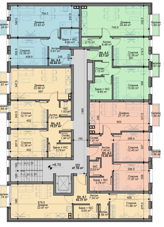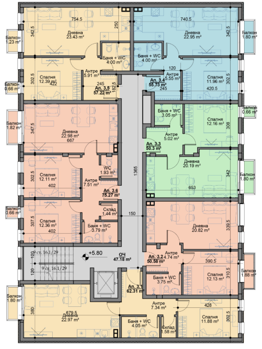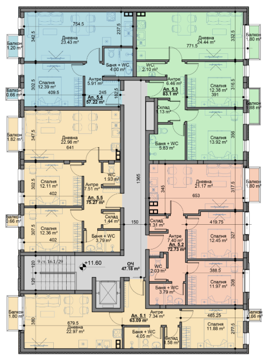 Останалите етаж съдържат още 22 апартамента, като общо в сградата са 24 жилища.