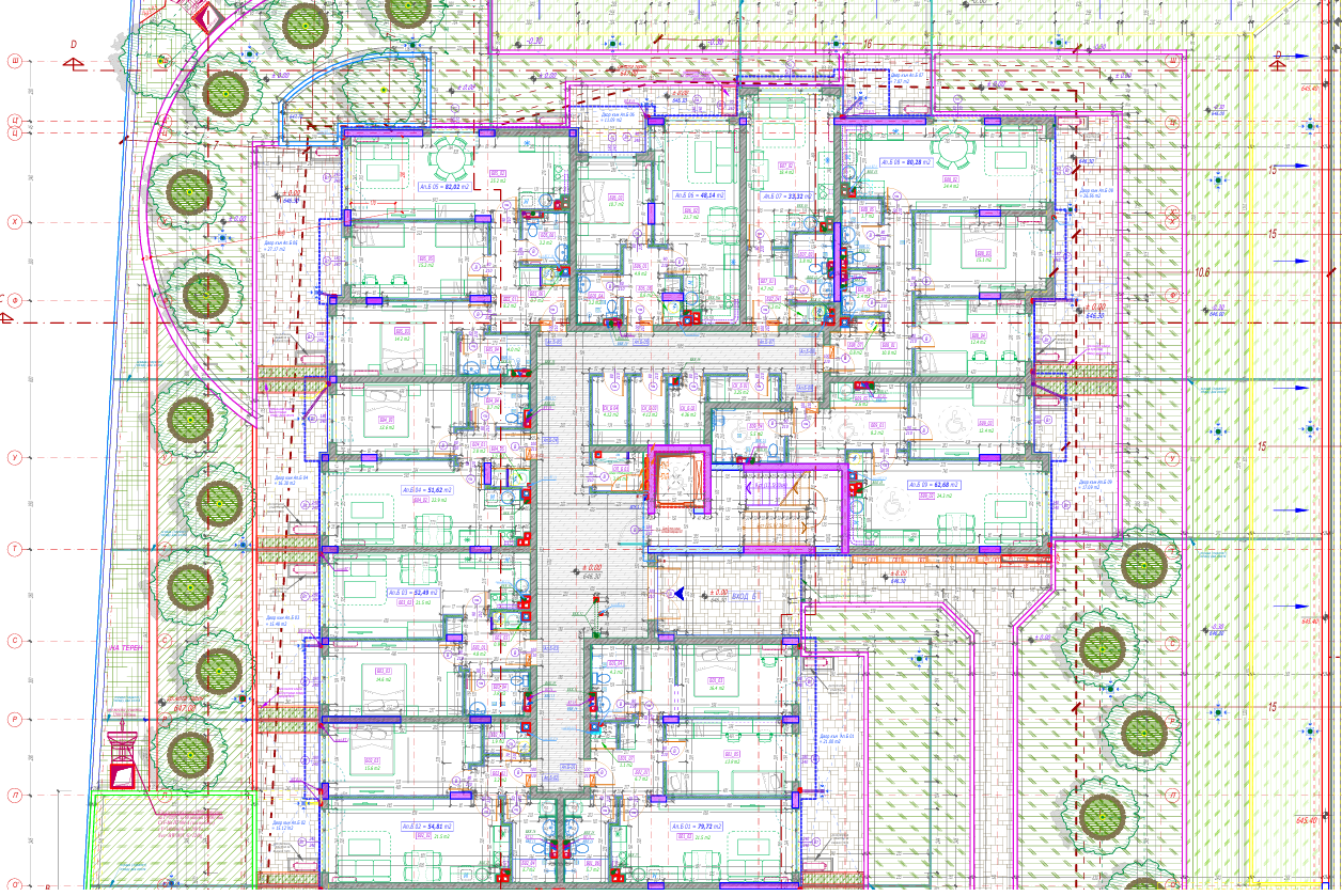 На партерния етаж са ситуирани жилища и открити дворове на кота на терена.