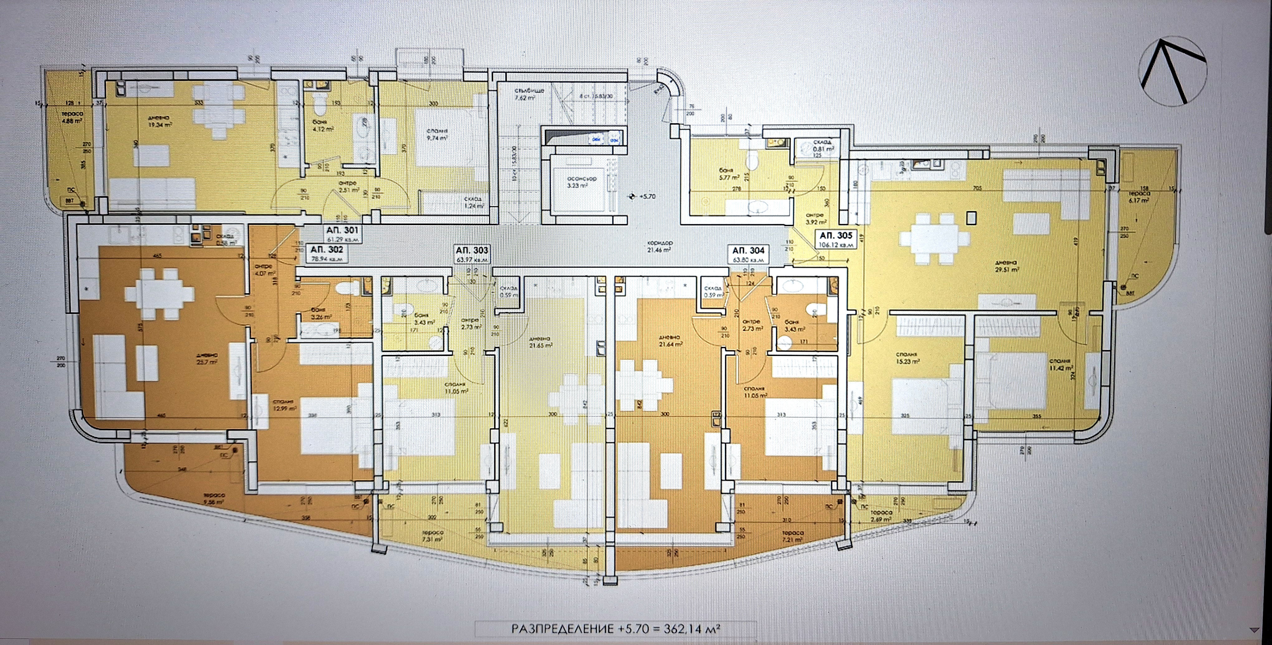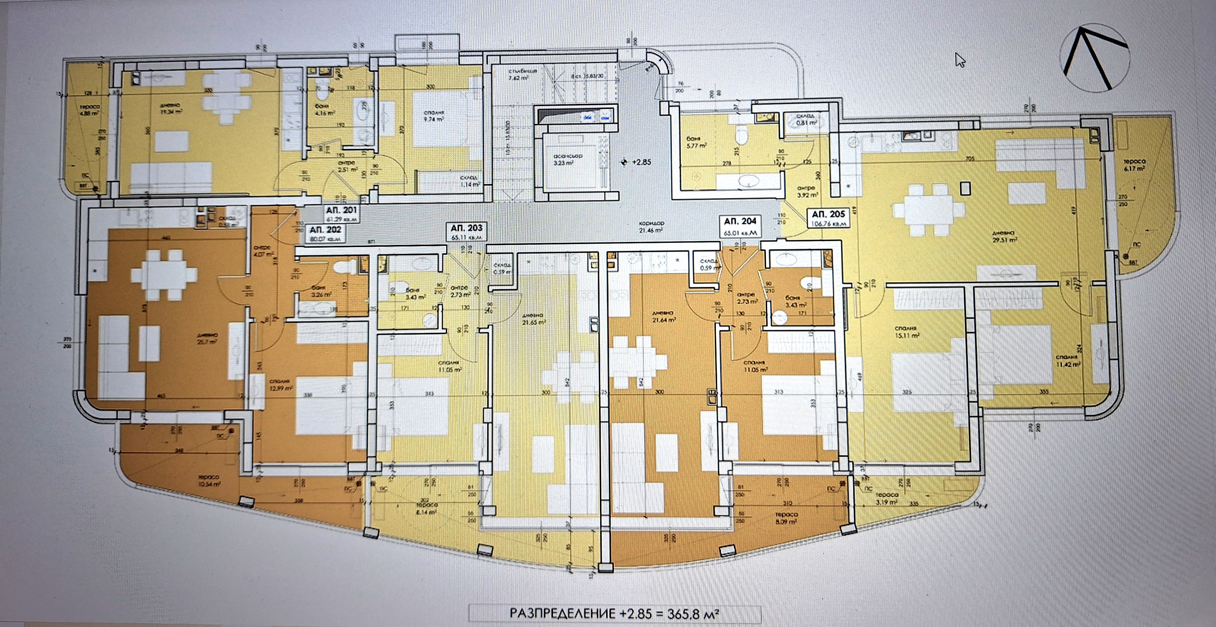 Сградата се състои от общо 18 апартамента – 16 двустайни и 2 тристайни, разположени на 4 етажа с луксозен асансьор (стигащ и до подземният гараж):