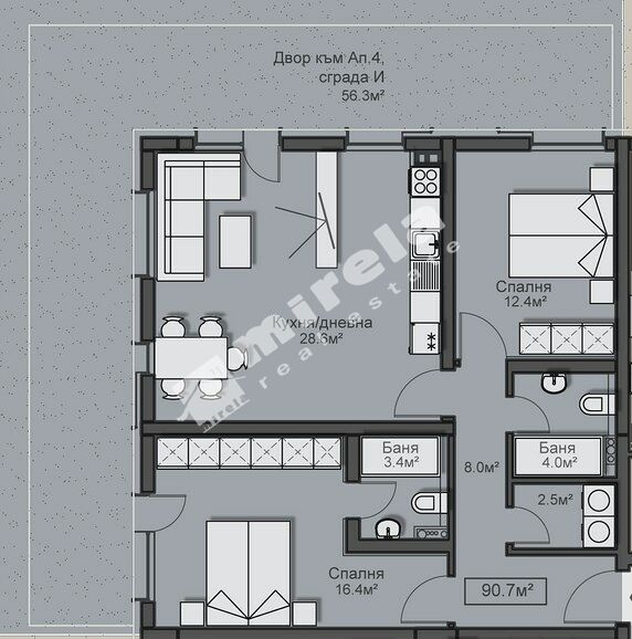 Апартаментът се състои от антре - коридор, две самостоятелни спални, едната със собствена баня, просторна всекидневна с кухненски бокс, отделна баня и мокро/складово помещение. От всички стаи има достъп до просторна тераса (56 кв. м), ориентирана към зеления двор.