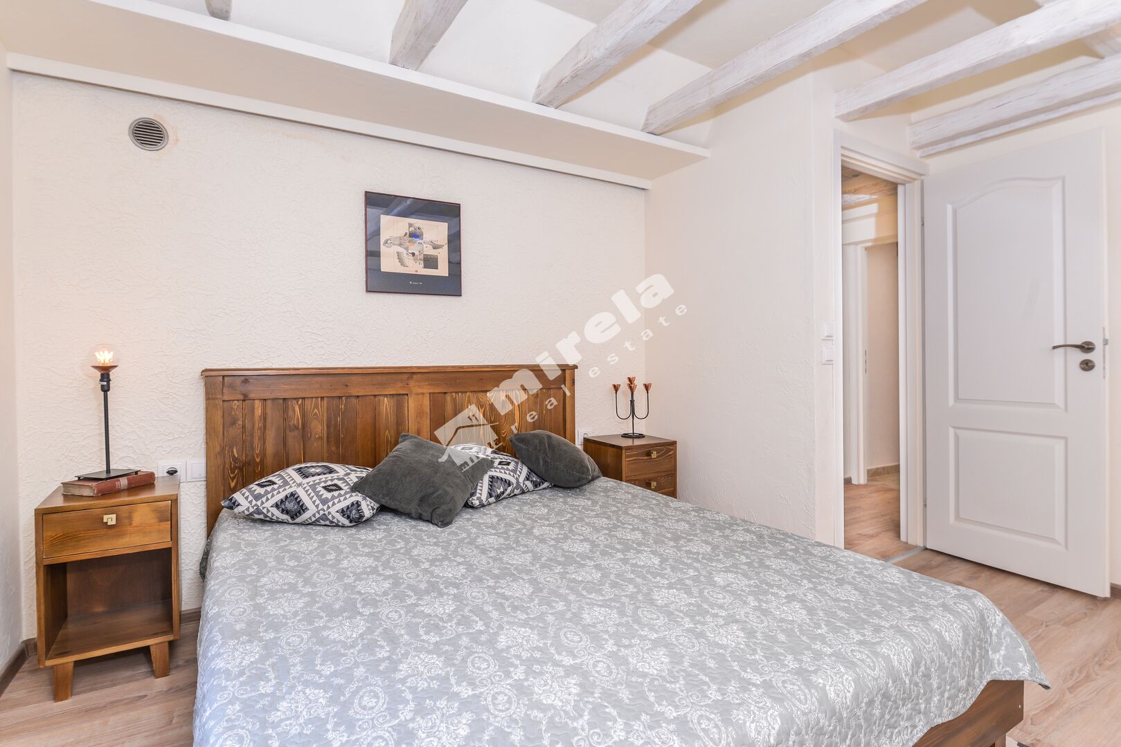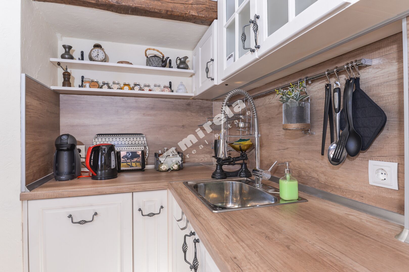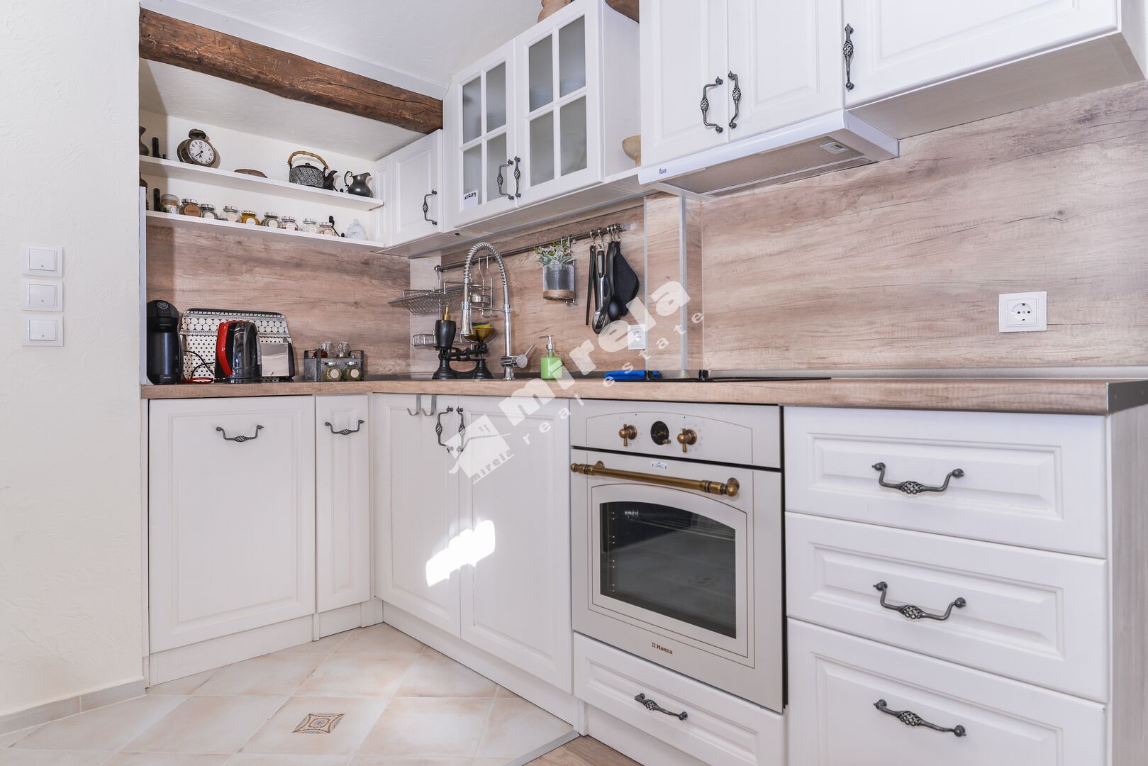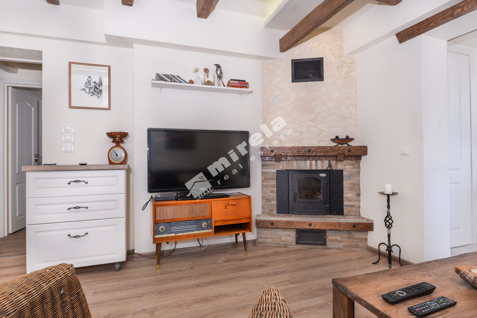 Състои се от хол с трапезария и кухненски бокс, две спални и баня с тоалетна. Отоплява се на ток - конвектори и климатик, има работеща камина на дърва. При обзавеждането е запазен духа на имота с гредите на тавана и мебели в ретро стил.