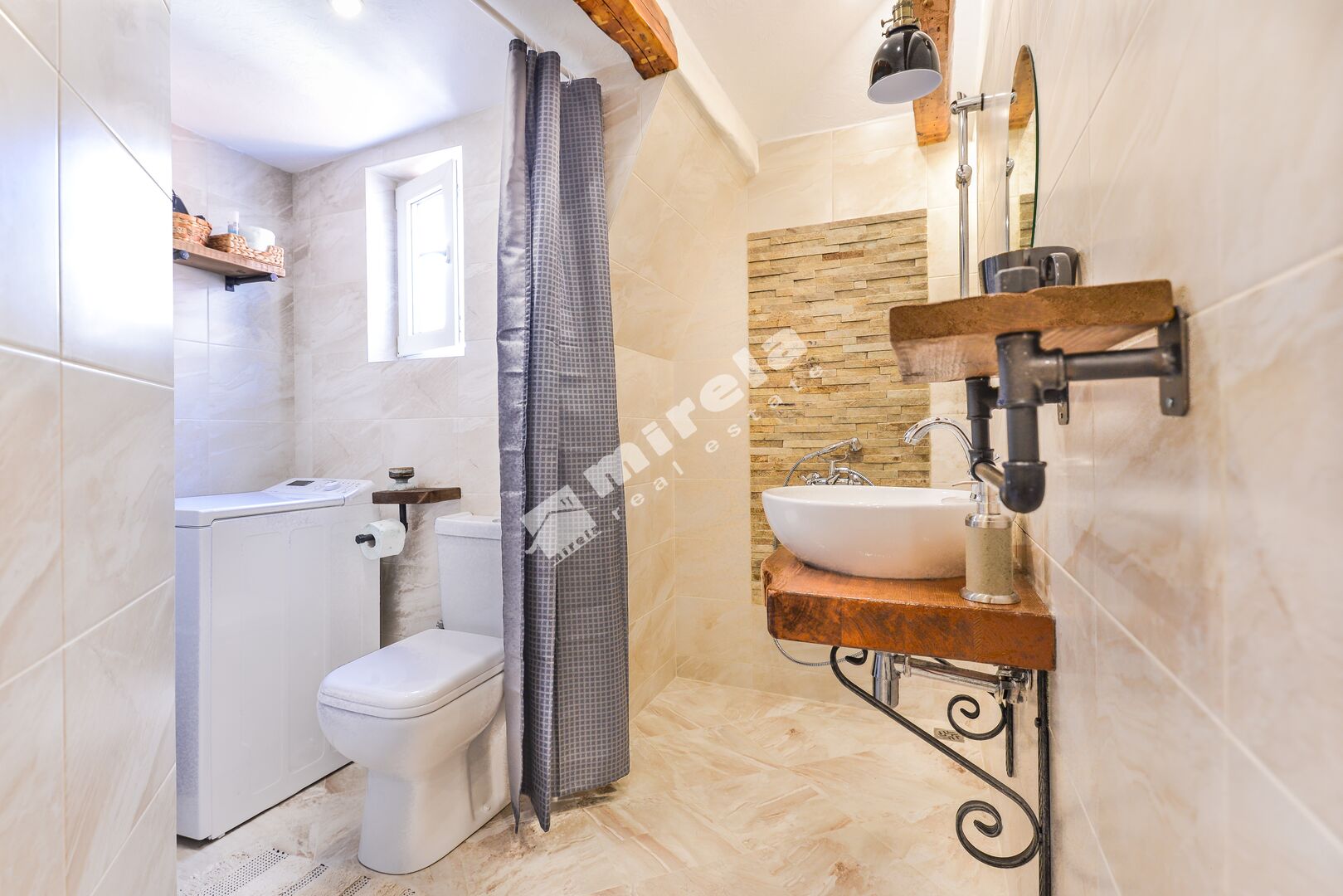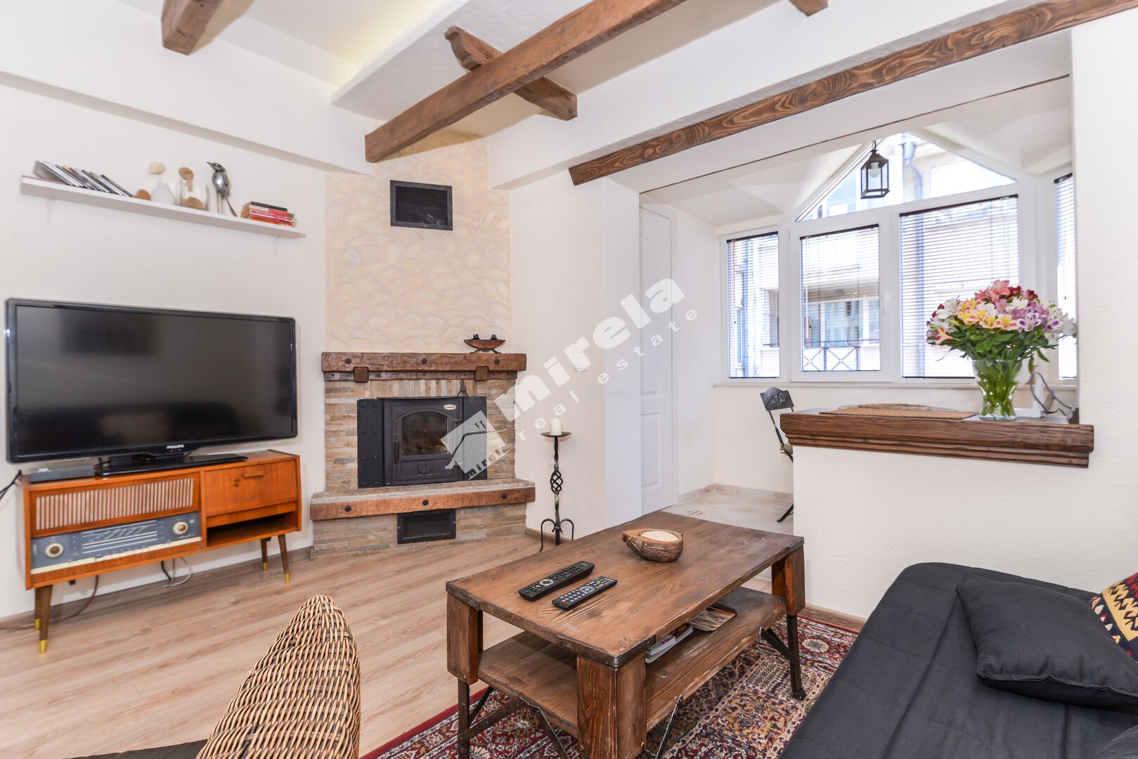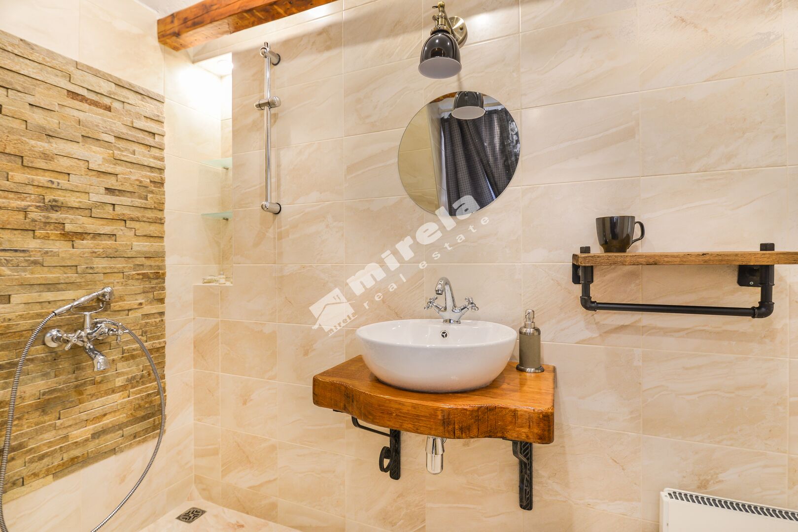 Състои се от хол с трапезария и кухненски бокс, две спални и баня с тоалетна. Отоплява се на ток - конвектори и климатик, има работеща камина на дърва. При обзавеждането е запазен духа на имота с гредите на тавана и мебели в ретро стил.