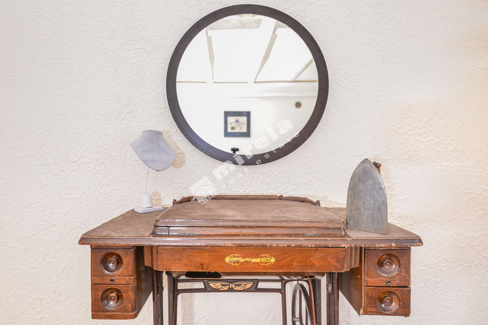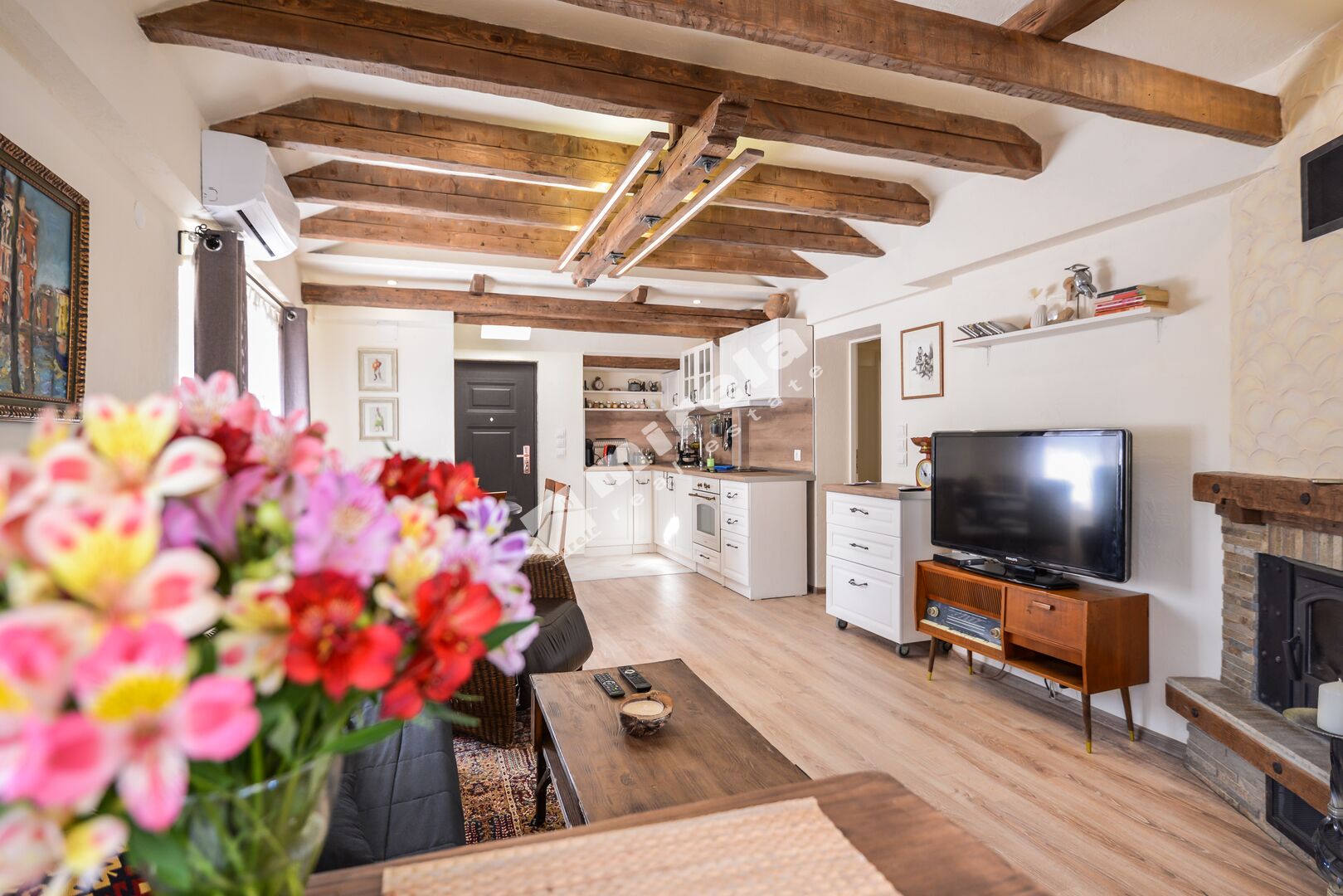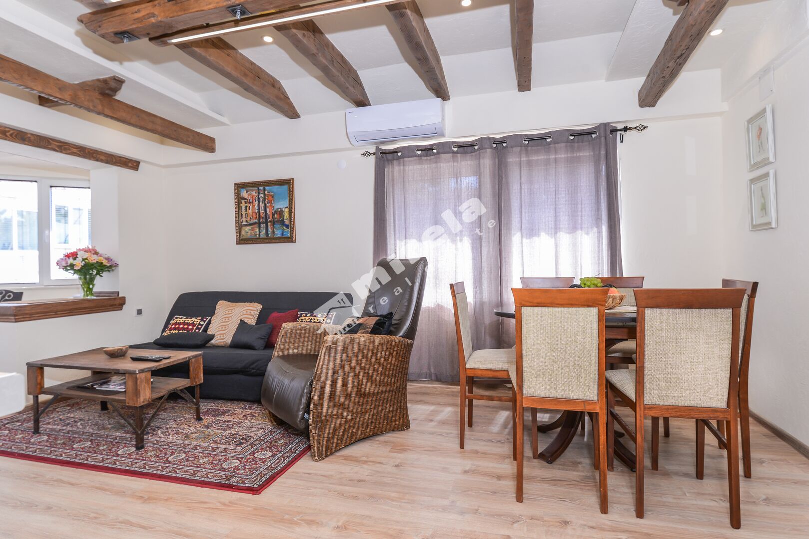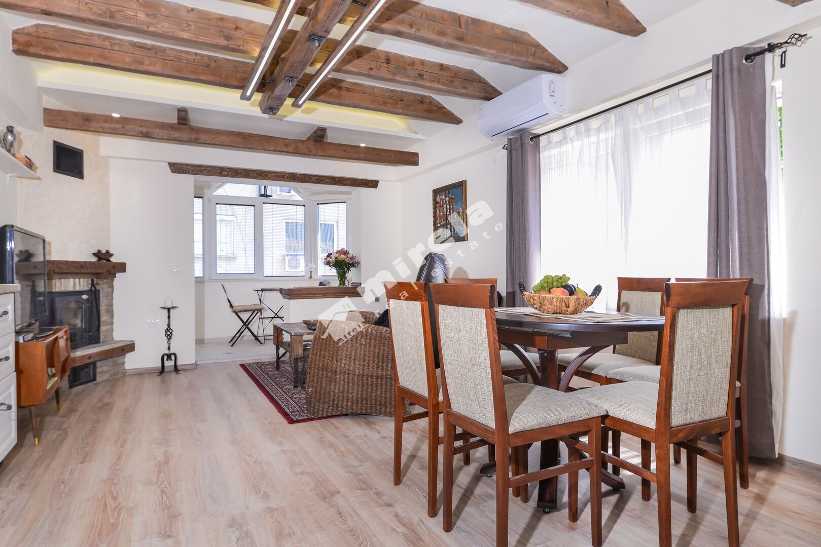 Състои се от хол с трапезария и кухненски бокс, две спални и баня с тоалетна. Отоплява се на ток - конвектори и климатик, има работеща камина на дърва. При обзавеждането е запазен духа на имота с гредите на тавана и мебели в ретро стил.
