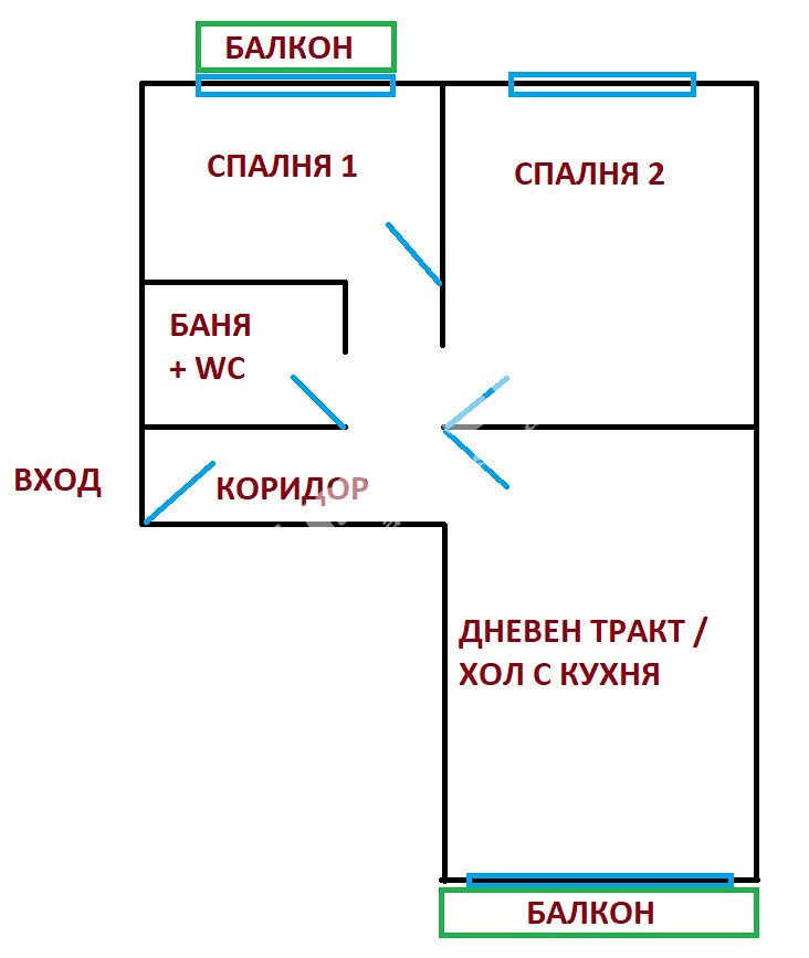 Разпределението включва коридор, дневна с кухненски бокс, две спални (голяма и малка), баня с тоалетна и два балкона. жилището се продава обзаведено.