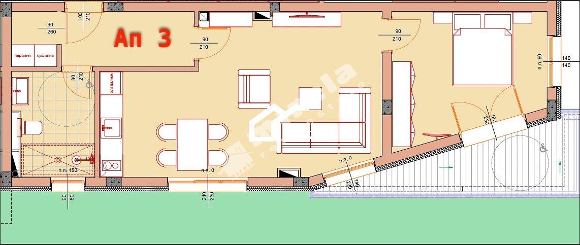 Жилището е с функционално разпределение: коридор, мокро помещение, дневна с кухна, една спалня, една тераса.