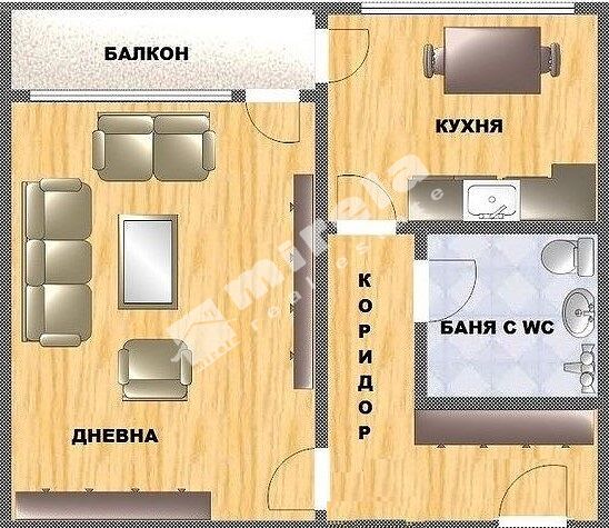 Апартаментът се състои от коридор, хол и кухня от които се излиза на балкон тип лоджия, баня с тоалетна. Нуждае се от ремонт, който удачно може да бъде съчетан с вътрешно преустройство на апартамента в 2-СТАЕН, като се изгради кухненски бокс на балкона пред дневната, а кухнята се обособи като самостоятелна спалня.